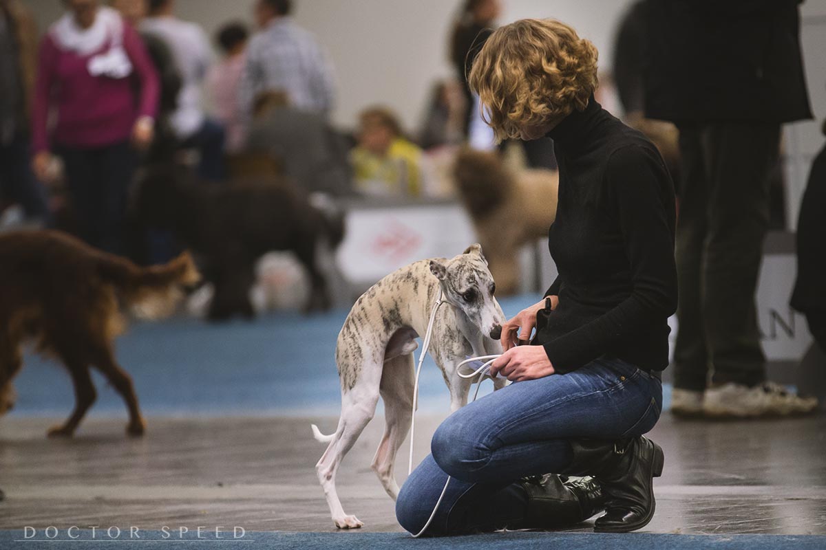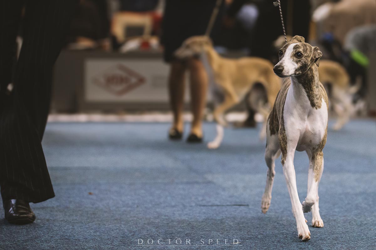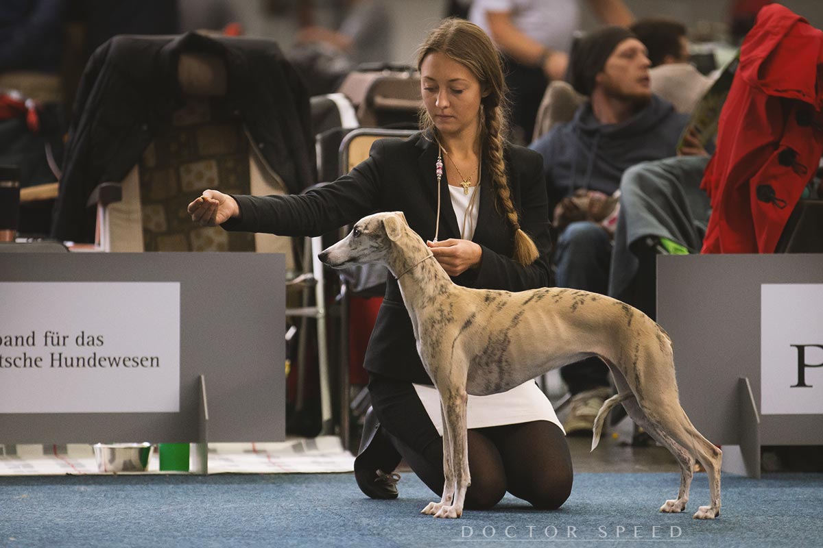 Denn die Whippets waren von der Mitte der Halle 6 fast in die ganz hintere Ecke umgezogen. Der schwedische Richter Per Lundström war leider aus gesundheitlichen Gründen verhindert. Marion Marpe sprang für ihn ein, 42 Whippets zu richten. Dannys Auftritt in der Jungendklasse war derart vermurkst, dass ich mich über Frau Marpes V und den schönen Berichte tatsächlich gewundert habe. Er zeigte nichts von der „enormen Ringpräsenz„, die ihm noch bei den letzten Ausstellungen bescheinigt wurde, denn die Halle machte in nervös. Er stand nicht schön, er lief nicht schön und ich hake es ab unter Erfahrungen.