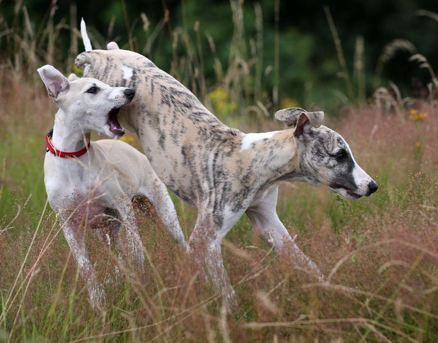 Wir befinden uns nun mitten im Szenario 2 der neun Gründe. Ich darf mir gar nicht vorstellen, mit wie viel Schwung wir aus einer Welpenspielstunde fliegen würden, hätte Danny denn eine gebucht. Mono war schon sehr unbeschwert im Umgang mit anderen Hunden, aber Danny passt so perfekt in das beschriebene Klischee vom ruppig spielen Whippetwelpen, dass ich mich fast vor meinem eigenen Text grusele.