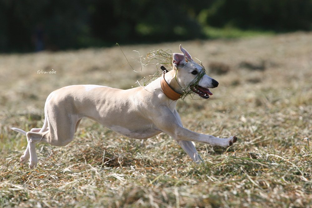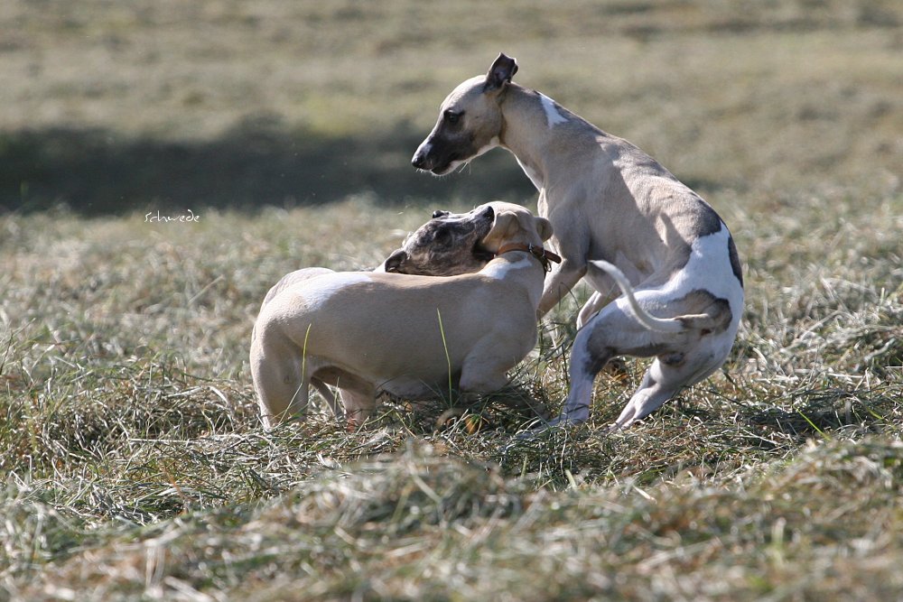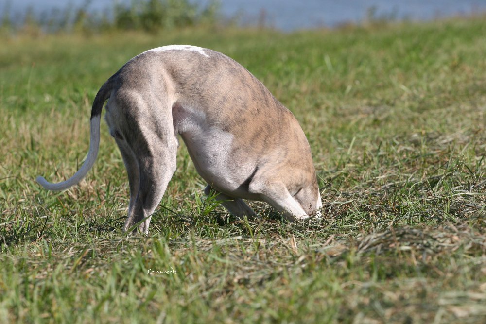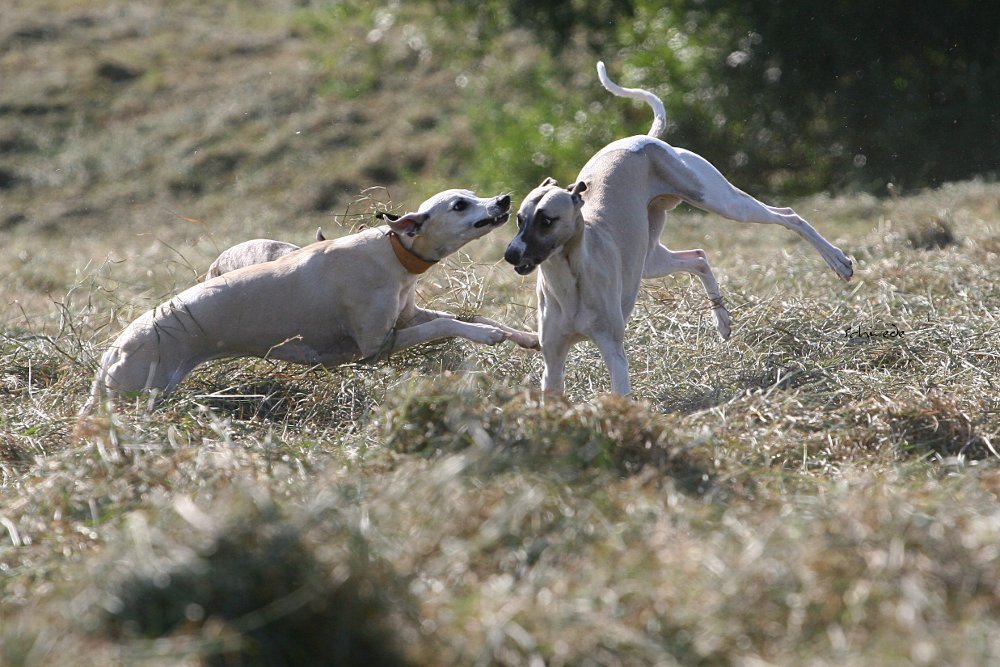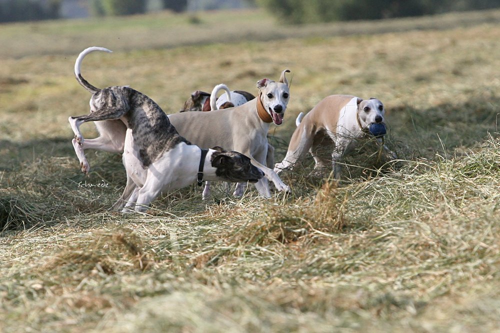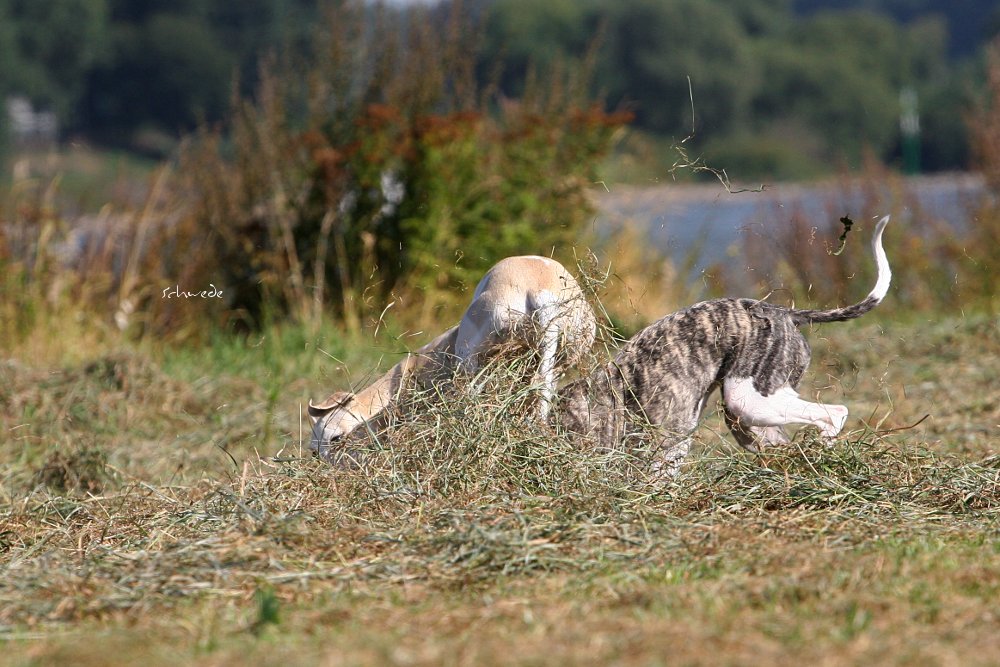 Heu – so stellten wir gestern fest – ist fast noch besser als Sand. Denn man kann sich hineinwerfen, sich kugeln, Überschläge proben, ohne großen Schaden zu nehmen. Heu knirscht nicht so schlimm zwischen Zähnen und in die Augen kriecht es auch nicht. Weht ein kühler Wind, ist Wasser in der Nähe und mehr Platz, als Horde Energiebündel nutzen kann, dann darf man das wohl einen perfekten Whippet-Ausflug nennen.