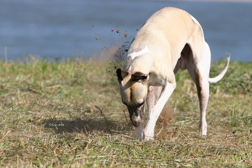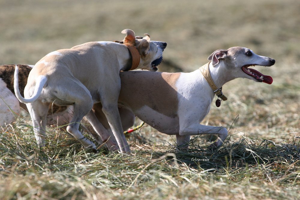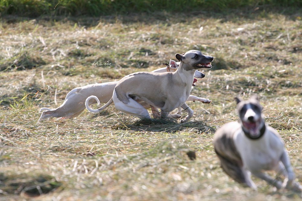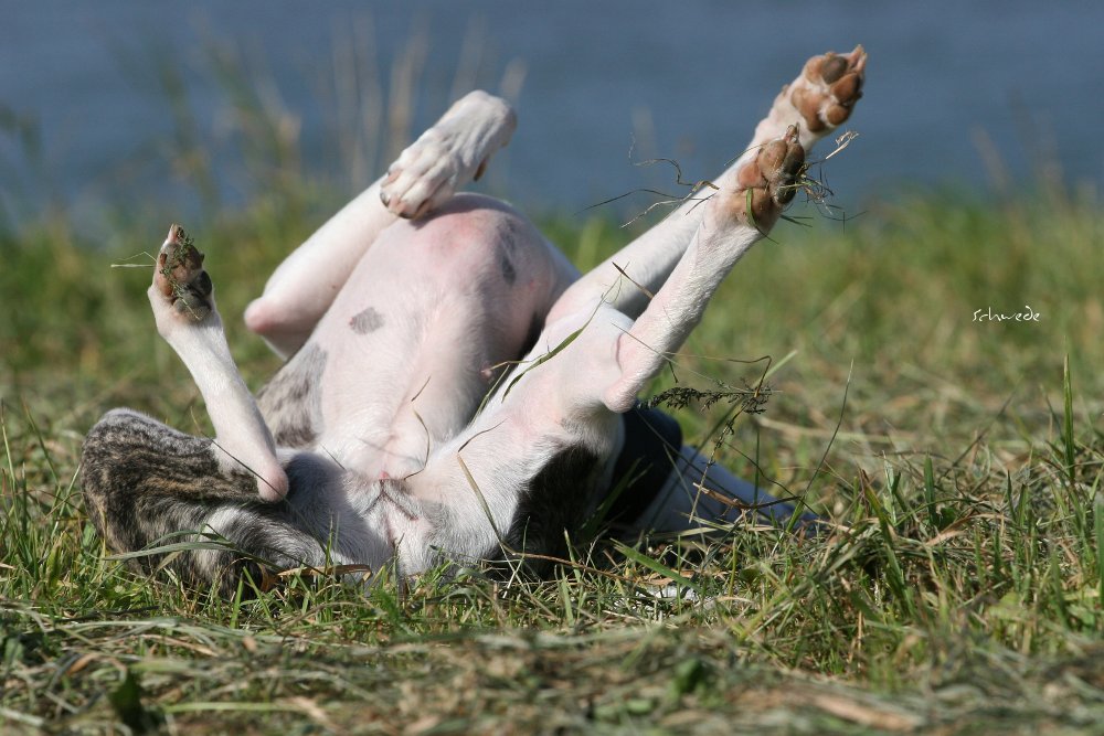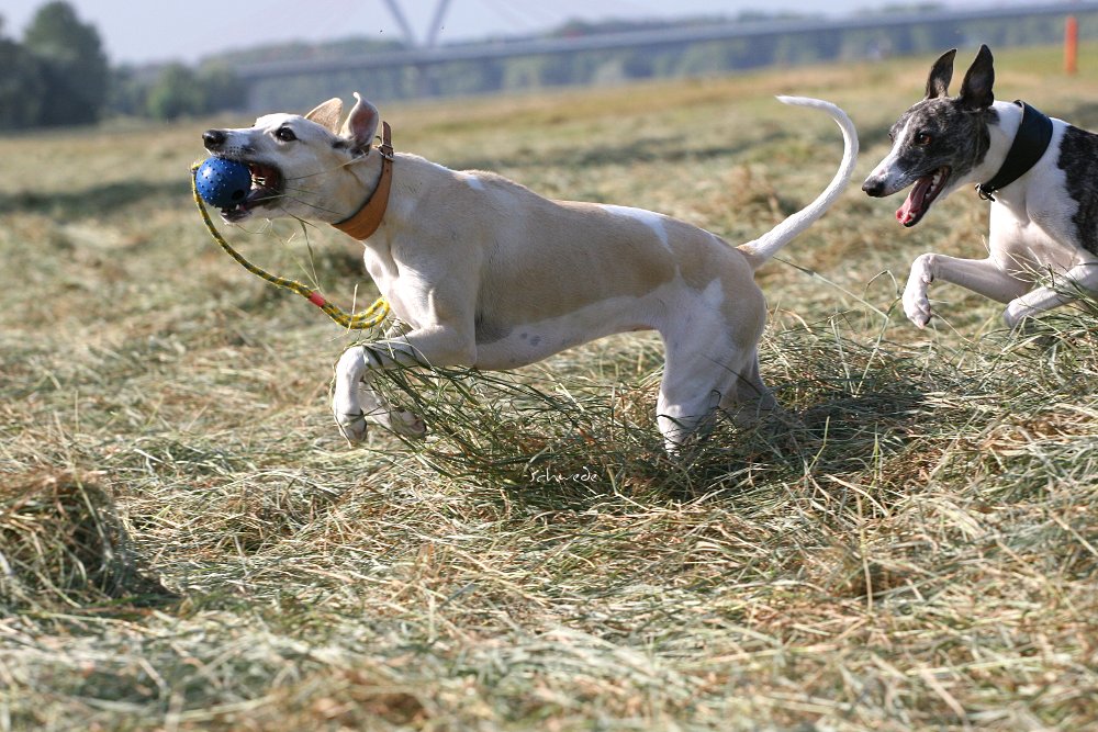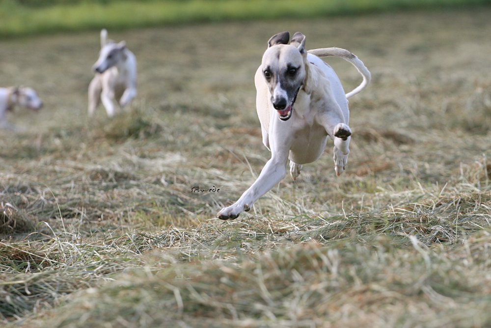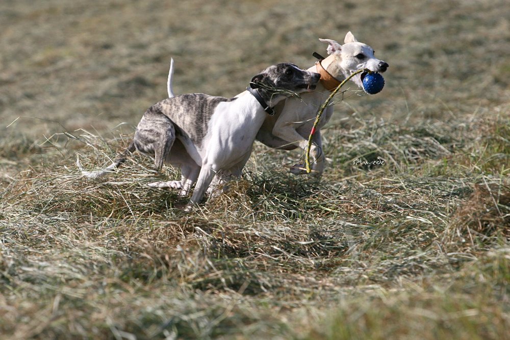 Heu – so stellten wir gestern fest – ist fast noch besser als Sand. Denn man kann sich hineinwerfen, sich kugeln, Überschläge proben, ohne großen Schaden zu nehmen. Heu knirscht nicht so schlimm zwischen Zähnen und in die Augen kriecht es auch nicht. Weht ein kühler Wind, ist Wasser in der Nähe und mehr Platz, als Horde Energiebündel nutzen kann, dann darf man das wohl einen perfekten Whippet-Ausflug nennen.