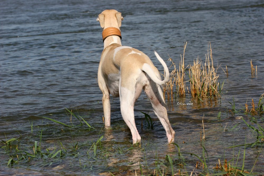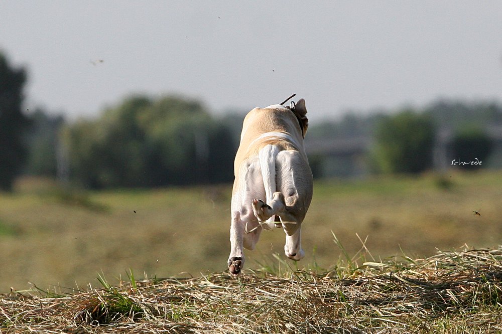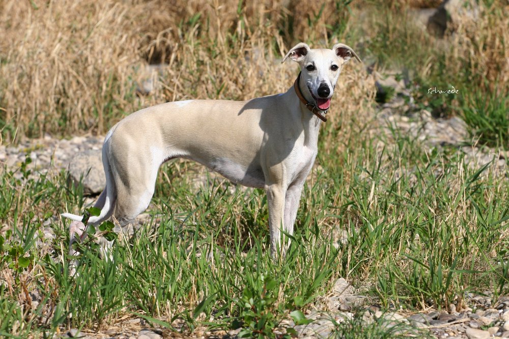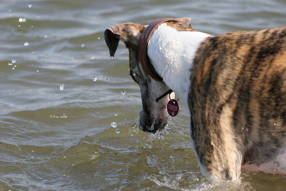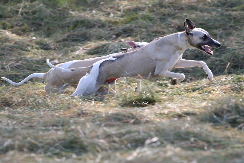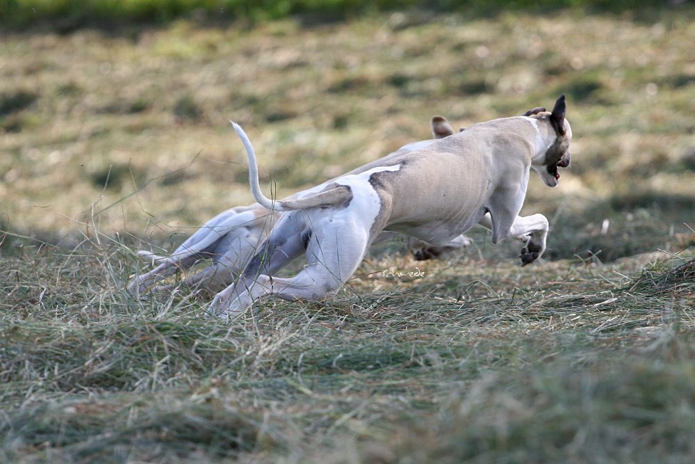 Heu – so stellten wir gestern fest – ist fast noch besser als Sand. Denn man kann sich hineinwerfen, sich kugeln, Überschläge proben, ohne großen Schaden zu nehmen. Heu knirscht nicht so schlimm zwischen Zähnen und in die Augen kriecht es auch nicht. Weht ein kühler Wind, ist Wasser in der Nähe und mehr Platz, als Horde Energiebündel nutzen kann, dann darf man das wohl einen perfekten Whippet-Ausflug nennen.