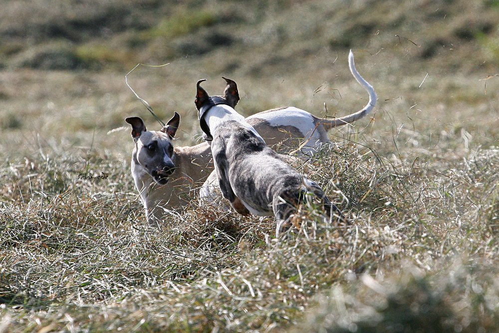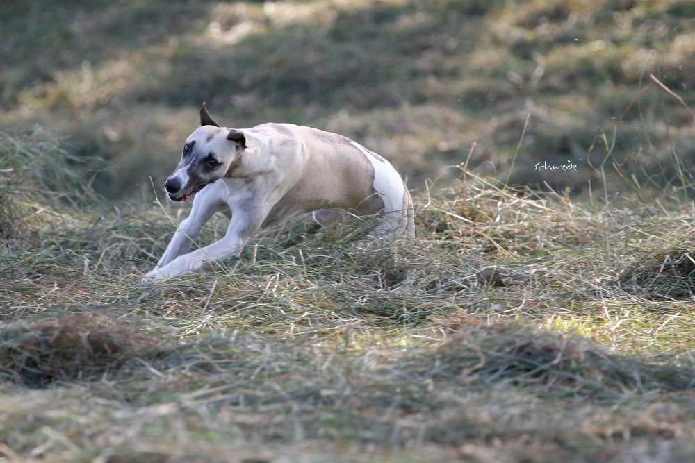 Sechs Whippets im Attacke-Modus sind immer eine Schau. Die wenigen Menschen, die unterwegs waren, mussten zwangläufig starren, wenn śich die vier Mädels von Liane Bertlich im vollen Lauf ins Heu eingruben. Ob sie wohl wieder hinausfinden? Mono wähnte sich im Paradies. Mr.Clark hingegen arbeitete intensiv an seinem Eingenbrödler-Image. Er lief kurz mit, konzentrierte sich aber dann aufs Mäuseausbuddeln. Das tut er mit derart viel Inbrunst, dass er ohne weiteres verloren gehen könnte, wenn er nicht ab und zu mal den Kopf aus dem Erdreich zöge, um nachzusehen, ob sein Rudel noch in Sichtweite ist.