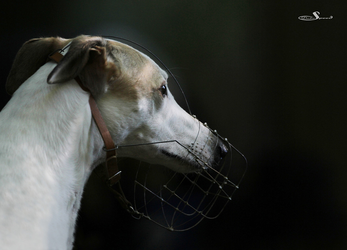 Ich fange mit einem Foto an, das von der ersten Sekunde an eines meiner Top-Favoriten war. Ich habe es bei der EM-Revanche in Gelsenkirchen am 29.09.2013 vor dem Start eines Greyhound-Laufes gemacht. Die Hündin stand vollkommen ruhig und konzentriert an den Boxen und wartete auf ihren Einsatz. Verzweifelt bin ich später an dem Restchen eines schwarzen Nylongeschirrs, das sie trug. Ich konnte es nicht wegschneiden und spurlos wegzaubern erst recht nicht, da meine Fähigkeiten in Sachen Bildbearbeitung eher eingeschränkt sind. Ausgerechnet dieses Foto wollte ich aber auf keinen Fall aufgeben. Rettung nahte dann in Gestalt von Nele Ellerich, die bekanntermaßen eine Photoshop-Virtuosin ist.