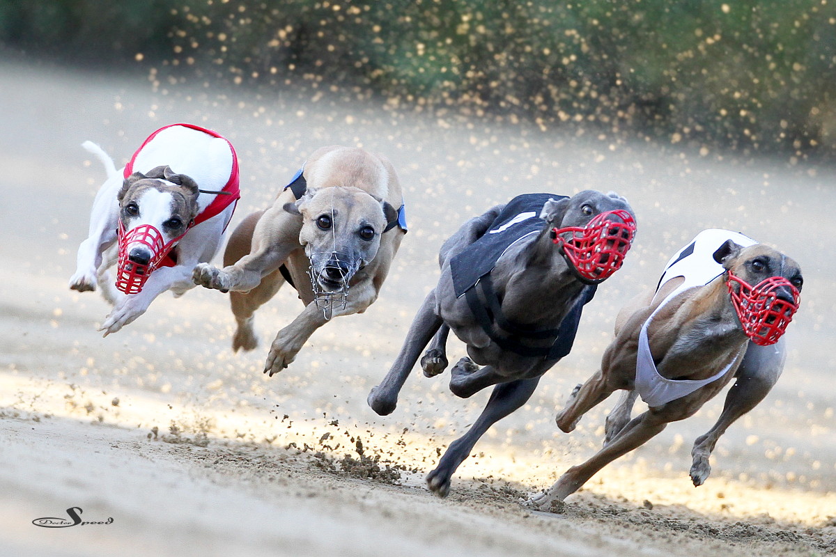 Wer schon mal an der Rennbahn fotografiert hat, weiß, wie winzig, winzig klein das Zeitfenster ist, in dem man Whippets in Full Speed in oder hinter einer Kurve erwischen kann. Mit einer 300mm Festbrennweite ist das Fenster noch einmal kleiner. Ich habe die Kurve ins Visier genommen, die Luft angehalten, ausgelöst und im gleichen Moment waren sie wieder weg. Danke ihr verrückten Hunde! Es macht einen riesigen Spaß, euch zuzusehen.