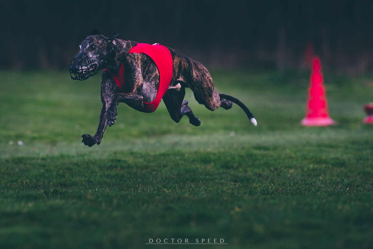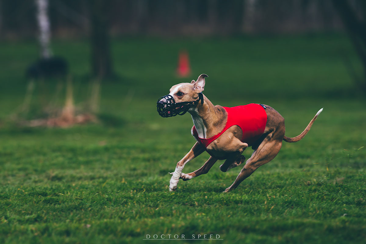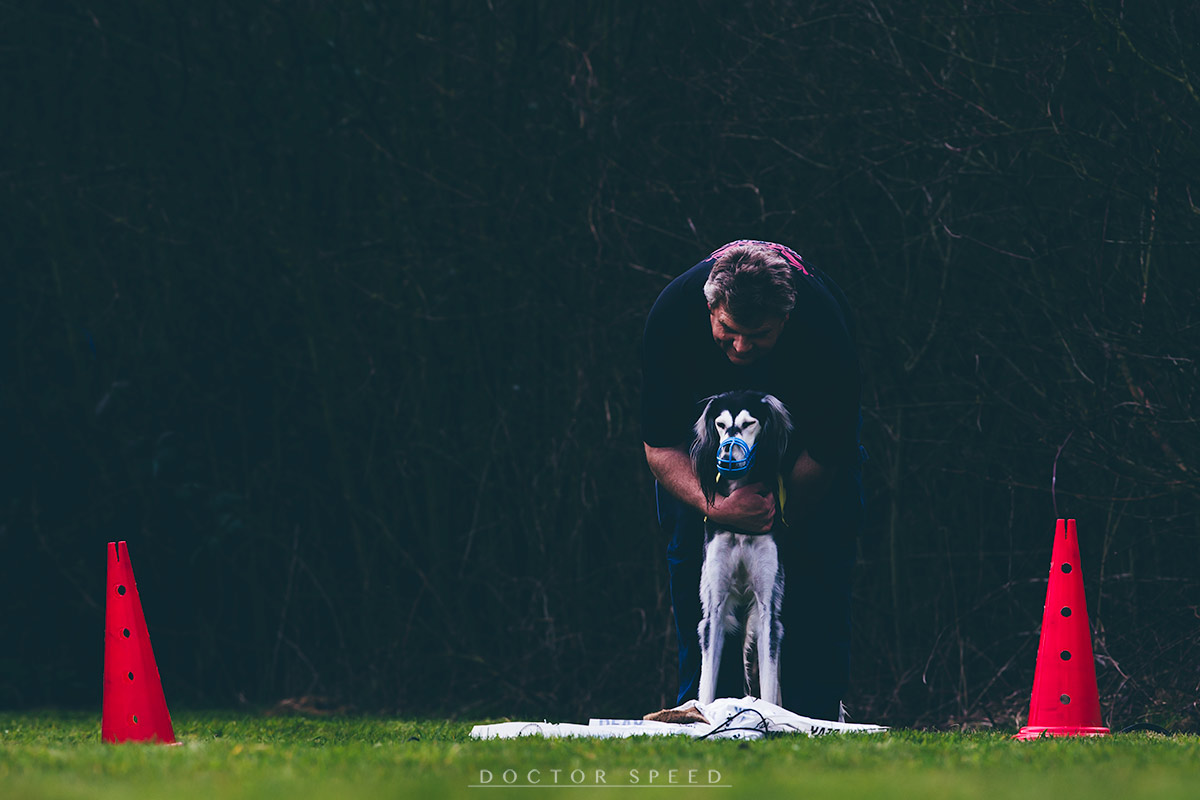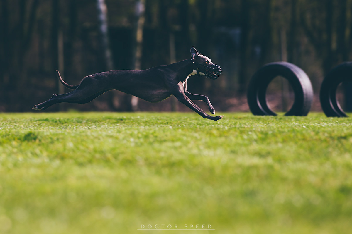 Vorsorglich bleibe ich mit Mono immer weit weg vom Coursingfeld, doch sobald er die Maschine hört, macht es in seinem Kopf laut Klack. Dann ist es an mir, Ruhe zu bewahren und ihn immer wieder in die Realität zurückholen, damit er nicht schon vor seinem Lauf völlig fertig ist.