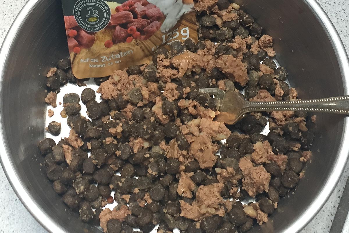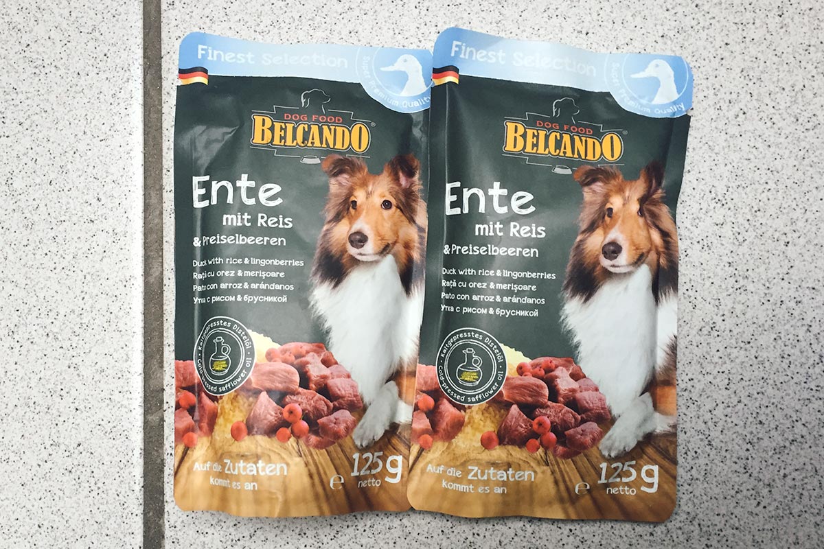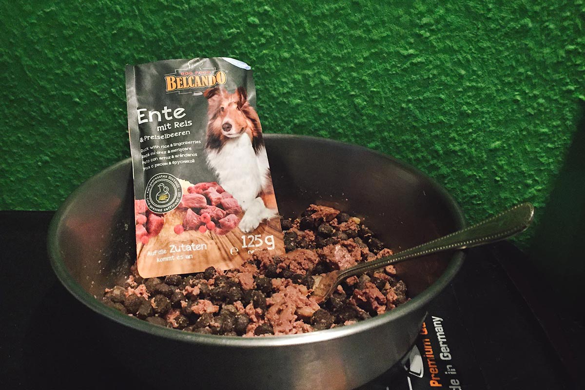 Manchen wir die Sache also spannender, dachte ich mir und sorgte für ein Schmecklecker. Belcando bietet mit der Finest Selection Fleisch in kleinen Frischebeuteln an. Nicht als Alleinfutter, sondern als das Sahnehäubchen auf der Trockenfuttertorte sozusagen. Ich habe am Morgen eine 125 Gramm Tüte geköpft und den Jungs jeweils die Hälfte unter das Trockenfutter gerührt. Und siehe da, Mono konnte die gepackte Kameratasche spontan vergessen und sich tatsächlich seinem Frühstück widmen. Danny fraß so schnell, dass er danach wieder jeden Rölpswettbewerb gewonnen hätte.