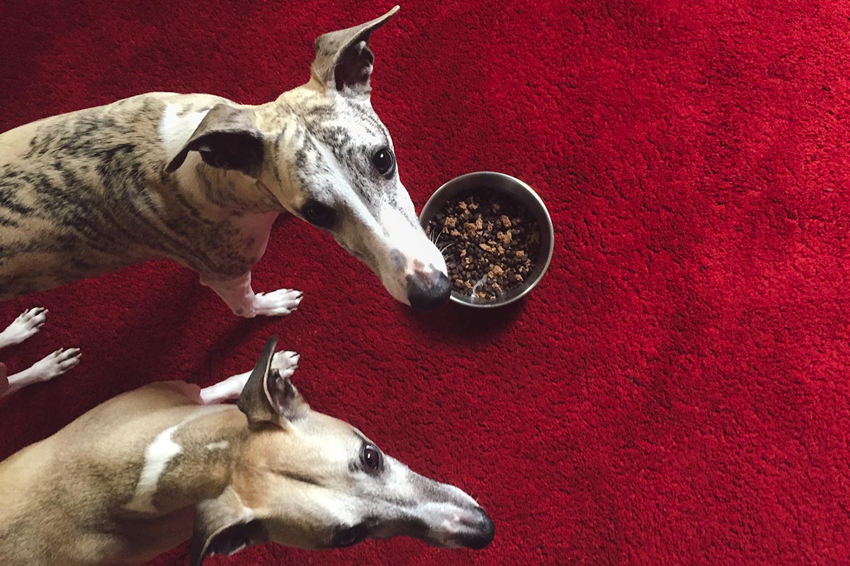 Ich habe mir jetzt die komplette Palette – Huhn mit Reis und Möhrchen, Rind mit Spätzle und Zucchini, Lamm mit Kartoffeln und Cranberries und die oben abgebildete Ente – ein paar Mal auf Halde gelegt. Die 125 Gramm Tüte reicht, um zwei Whippets glücklich zu machen und kostet rund 1,- Euro. Wenn wir also mal wieder so einen blöden Tag haben, dann kann ich mir zumindest sicher sein, dass die Jungs etwas im Magen haben. In meinen Augen ist dann Wer Hunger hat, der frisst schon! die falsche Taktik. Manchmal braucht man eben den roten Teppich, damit es allen Beteiligten gut geht.