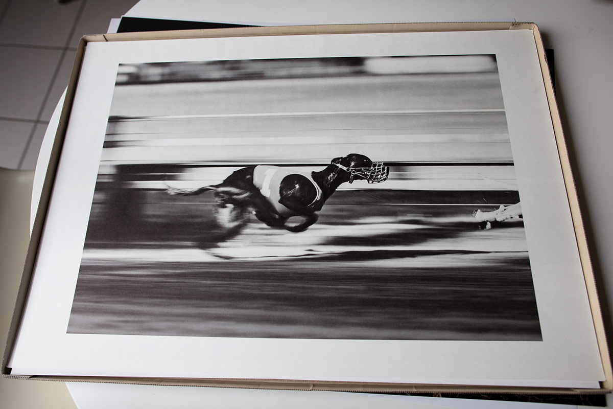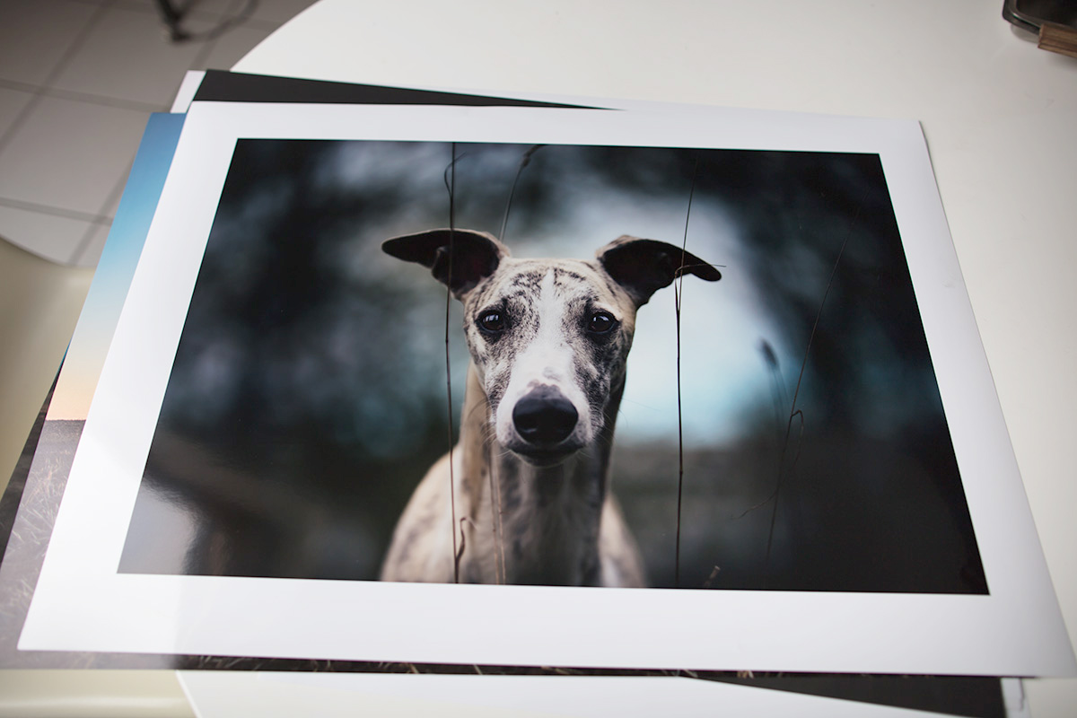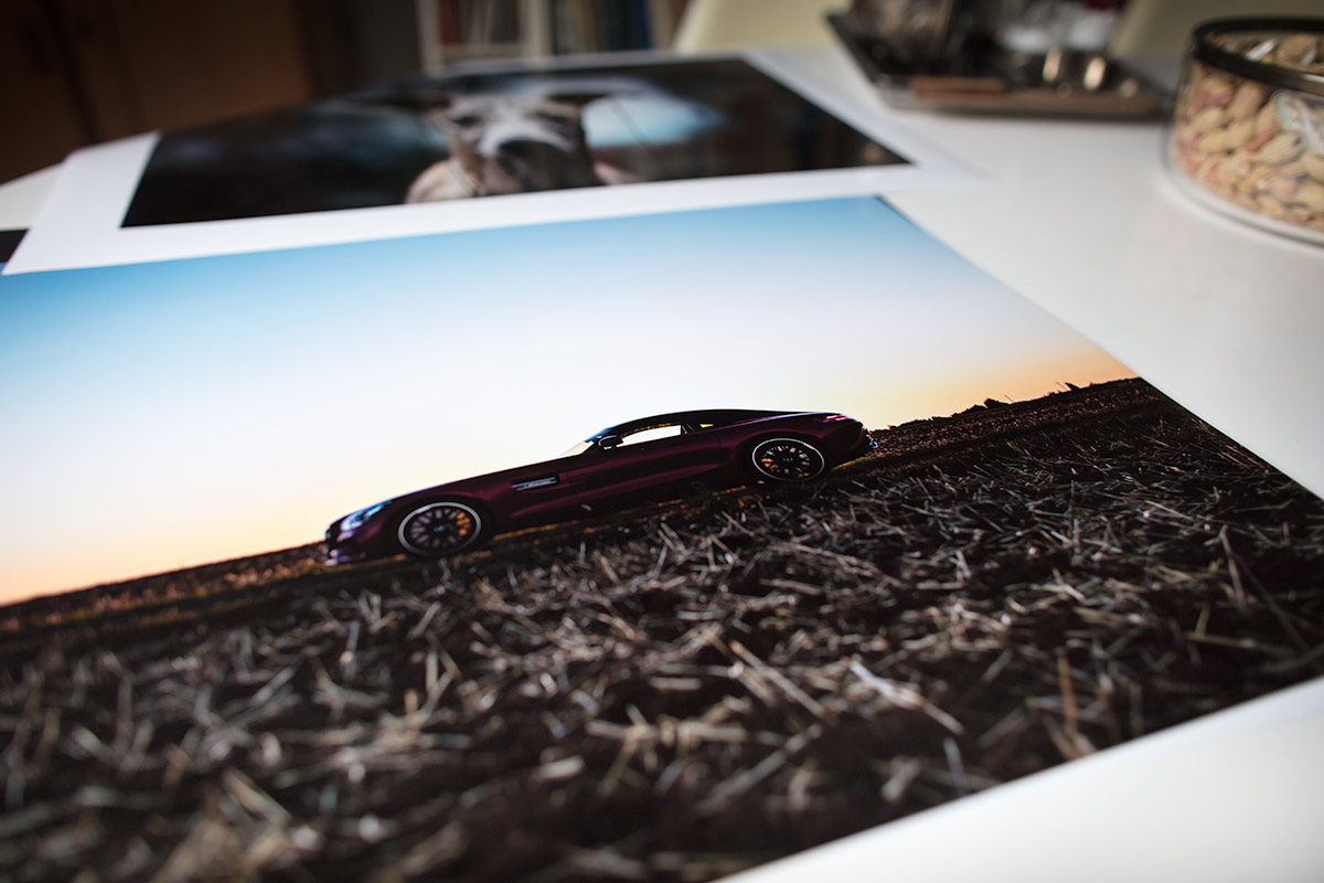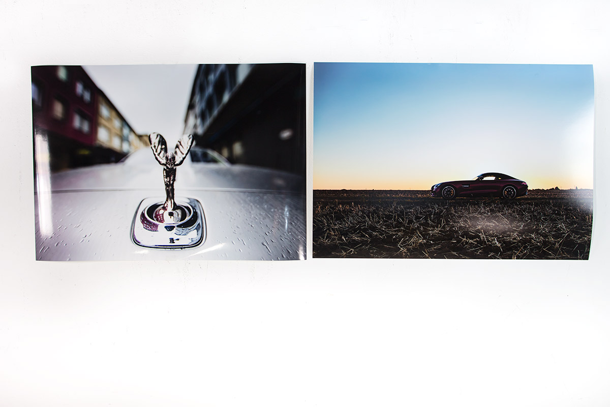 Ich bin ein Fan von mattem Papier. Entsprechend viel habe ich vom dem Premium Matt verbraucht. Die Schwarz-Weiß-Drucke auf den 210 Gramm-Bögen sind für mich das Größte. Aber auch farbige Fotos (wie z.B. das von Mono auf dem Sofa) werden bestechend gut. Mich hat wirklich beeindruckt, dass matte, monochrom schwarze Flächen vollkommen makellos sind. Keine Streifen, nichts. Als der Druck von der Front des Rolls-Royce (unten) durchlief, habe ich mich ganz kurz gefragt: Häh, warum ist das Papier nass! Blödsinnig, sicher, aber auch ein Beweis für die glasklare Wiedergabe von winzigsten Details.