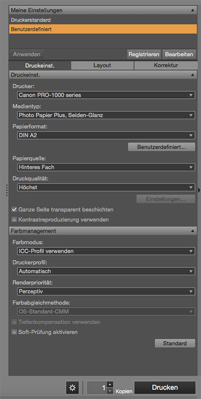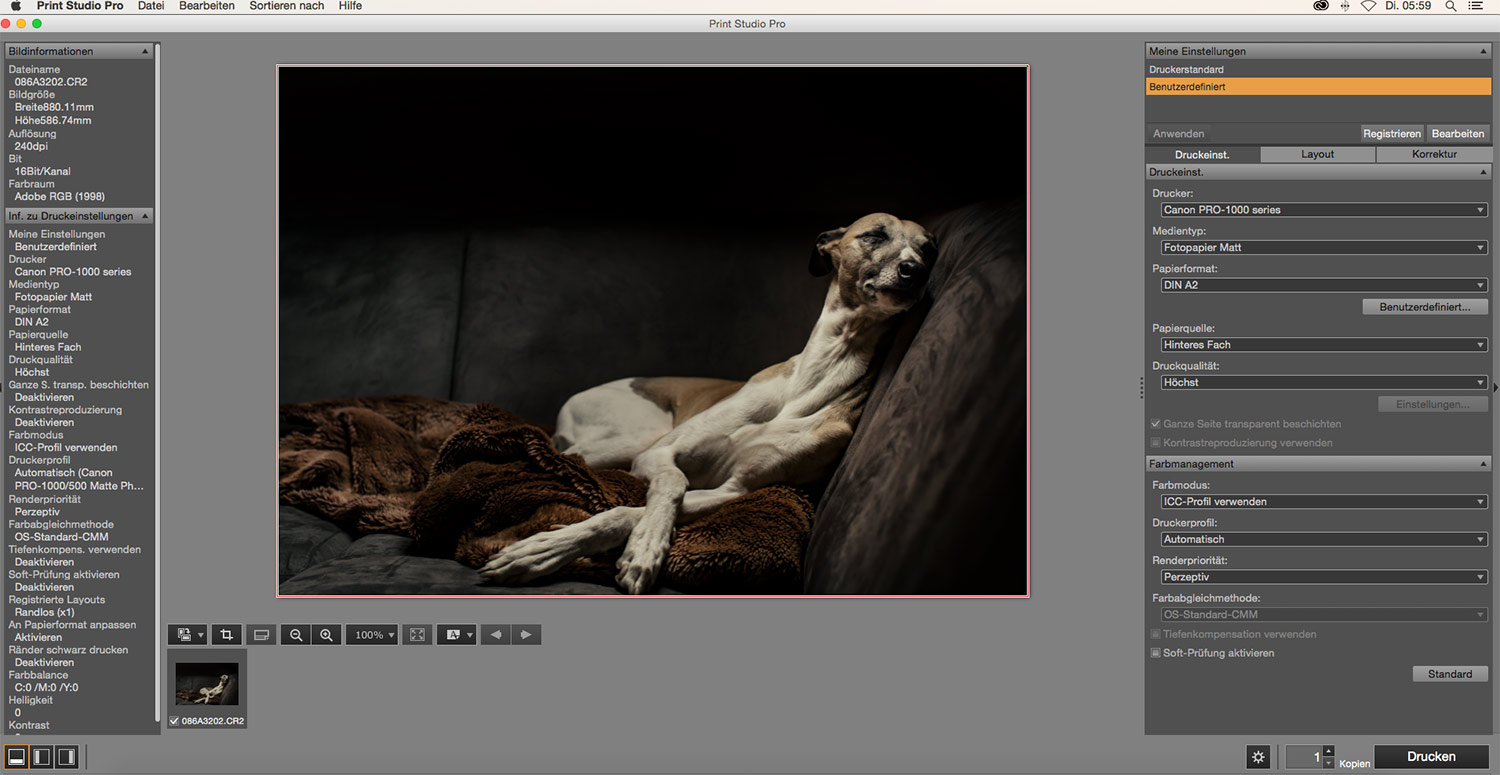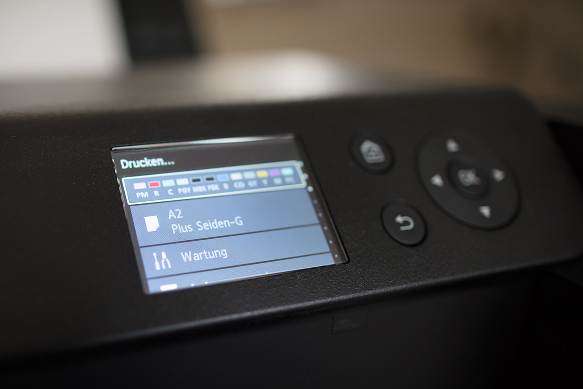 Um mir selbst ein Bild von dem zu machen, was der PRO-1000 kann, musste ich den Drucker zunächst einmal installieren und ins Netz hängen. Ich hasse solche Aktionen, weil es in der Vergangenheit immer an irgendwas hakte. Doch den Dicken arbeitsfertig zu bekommen, war zu meiner Überraschung denkbar einfach. Canon stellt Treiber und die Software Canon Print Studio Pro online zu Verfügung. Ich musste sie downloaden und der Rest ging erst simpel geführt und dann selbstständig. Die Drucksoftware installiert sich in Eigenregie in Photoshop oder  – wie ich es wollte – in Lightroom. Zwei, drei Minuten und zack, läuft das Ding. Bei uns tat es das über ein langes Netzwerkkabel, wer möchte, kann den Drucker aber auch ins WLAN hängen. Man muss tatsächlich nur sehr wenig tun. Am Display stellt man dann nur noch die Papiergröße und die Art des Papiers ein.