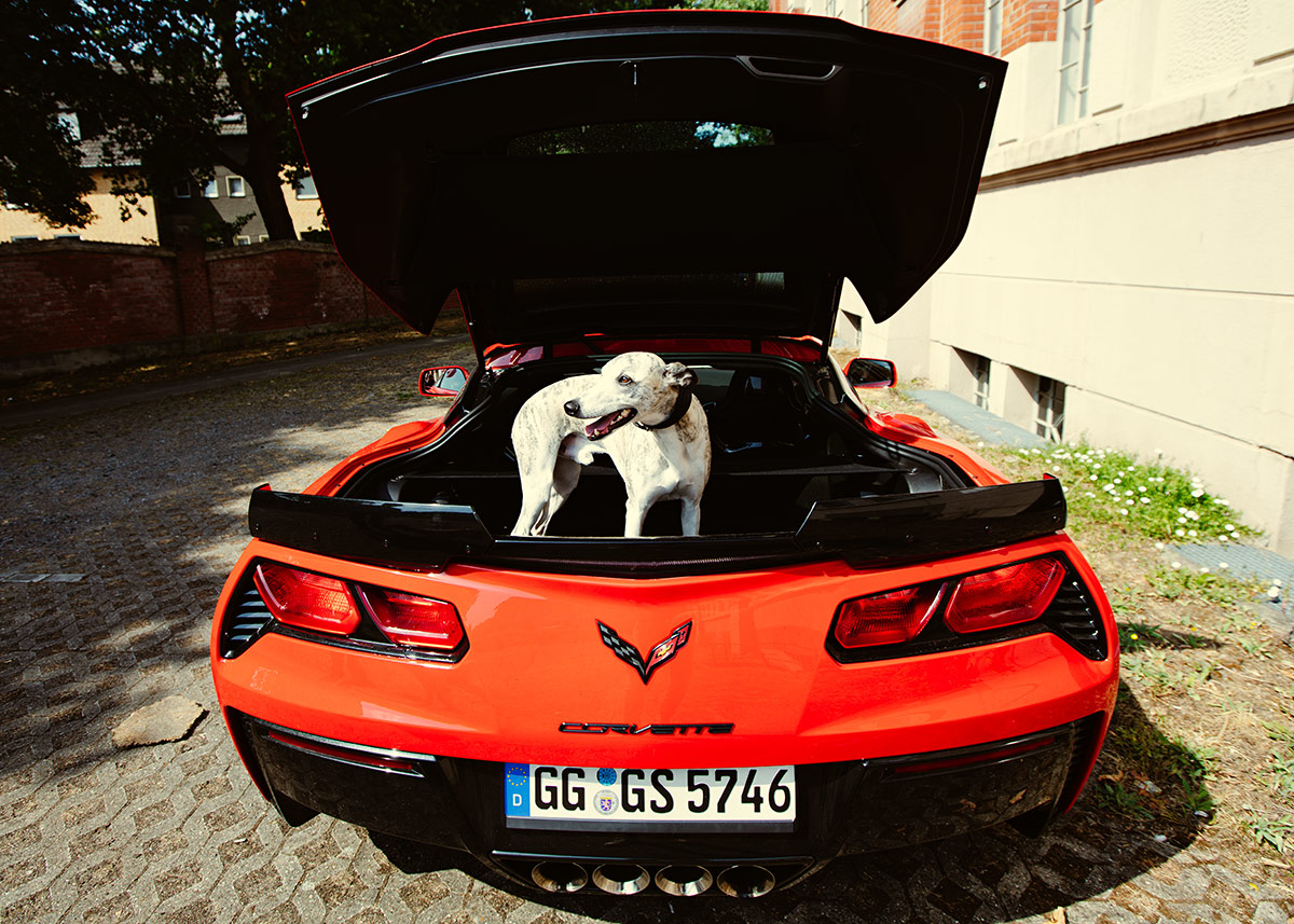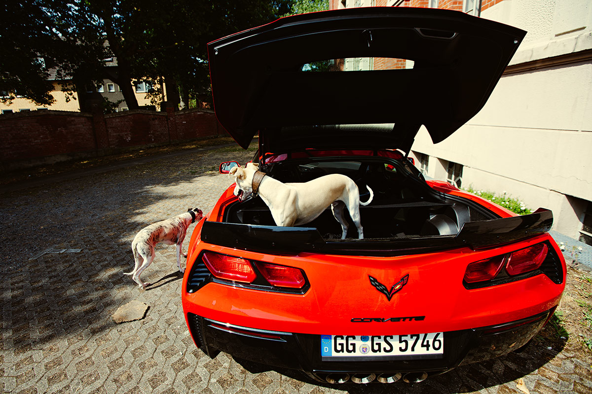 Es wäre irgendwie schick und so passend, doch das sportliche Fahren und der Transport von – wie in unserem Falle – durchaus sportlichen Hunden geht dabei nur selten bis nie zusammen. Einerseits natürlich, weil in ausgesprochenen Supersportwagen, wie in diesem Falle der Corvette Grand Sport, schlicht der Platz fehlt, andererseits weil die transportierten Hunde ihr Frühstück doch besser bei sich behalten sollten. Exzessives Kurvenbolzen ist mit dem Wuffi im Heck ein No Go. Wer nun denkt: „Ich kann es ja mal versuchen…“ Nein! Pfui! Und nein, du wirst deinem Hund auch kein rotes Fähnchen um den Hals binden und die Heckklappe mit einem Band zutüddeln! Es mag für den einen oder anderen zwar hart klingen, aber die Supersportler fallen aus. Alle!