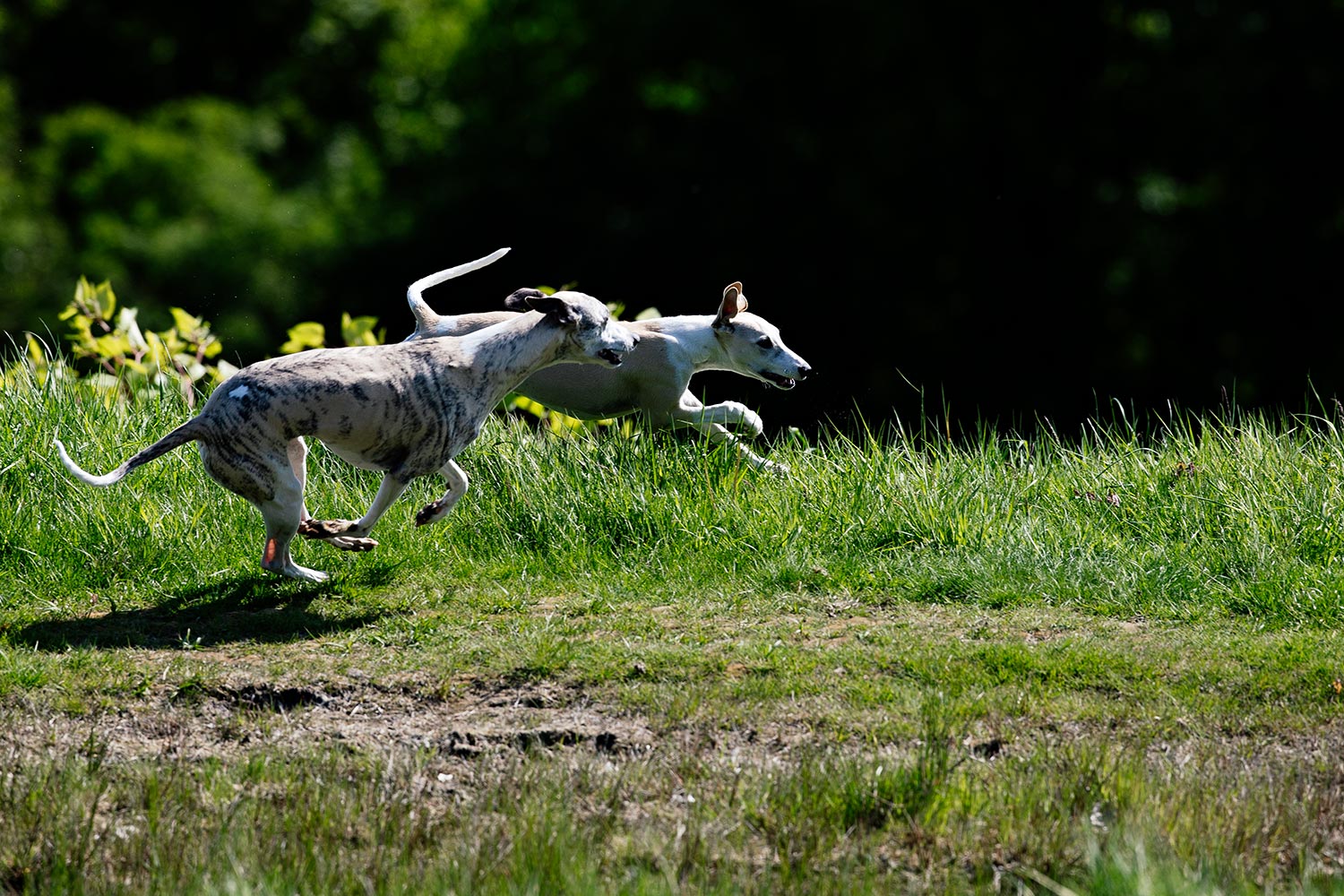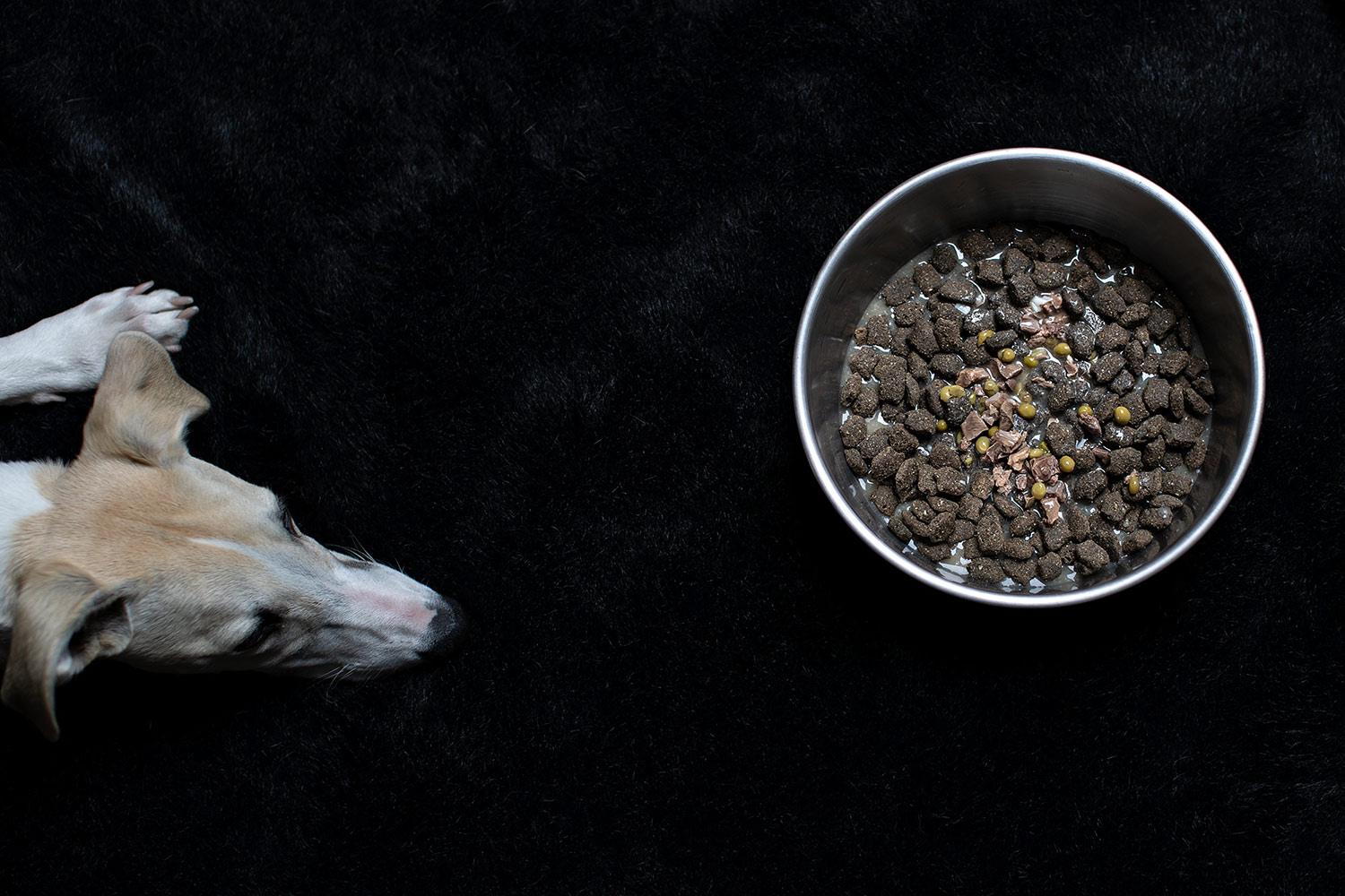 Ich habe meinen Whippets beigebracht, an einem bestimmten Ort zu warten, bis ihr Futter fertig ist. Doch der Duft des Toppings ließ sie jede Erziehung vergessen. Trippeln standen sie neben mir und 30 Sekunden später waren die Näpfe leer. Hudson ist noch zu jung für ein Adult-Futter, aber er würde sich die komplette Portion einverleiben. Soviel ist mal sicher. Wenn er sein Welpenfutter weggeputzt hat, wartet er immer und schaut, ob Mono ein paar Brocken liegen lässt. Oft scheint das so. Mono frisst sehr langsam und macht kleine Pausen zwischendurch. Dann muss ich den Zwerg kurz in Haft nehmen, damit er nicht Rest macht. Bei Danny gibt es ohnehin nichts zu holen.