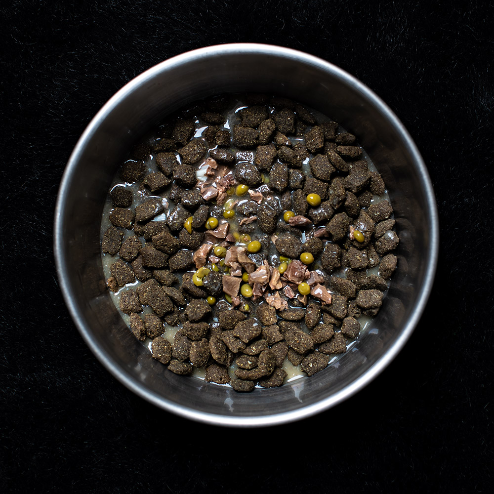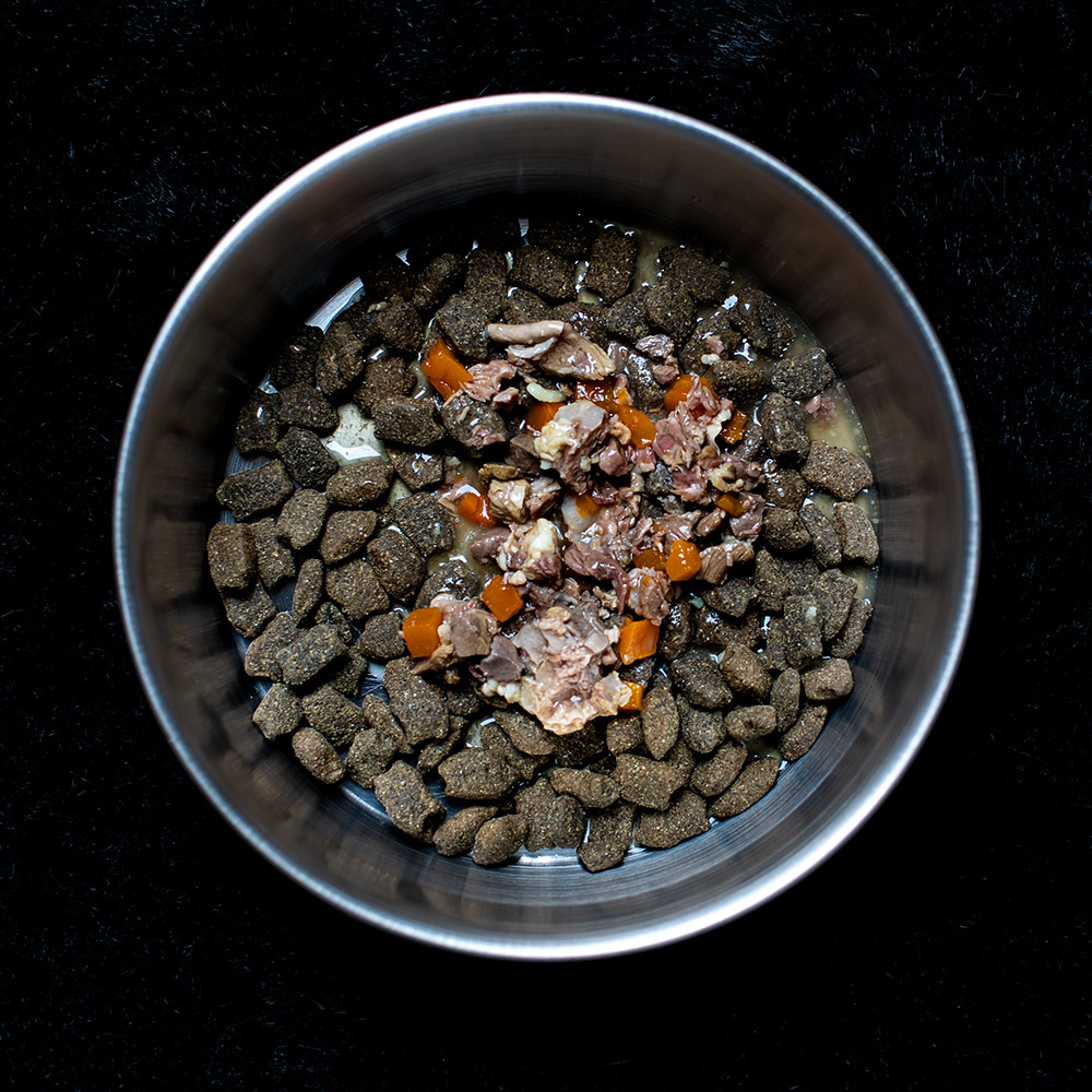 Oft gebe ich morgens die eine und abends eine andere Sorte. Morgens Turkey, abends Beef. Oder morgens Lamm und abends Ente. Bisher ist jeder der drei Näpfe in kurzer Zeit leergeputzt. Futterbezogene Ermüdungserscheinungen gibt es mit dem Mastercraft hier nicht. Die Fotos zeigen jeweils eine Portion Trockenfutter mit einer ganzen Tüte Topping oben drauf. Das findet hier im Normalbetrieb nicht statt. Ich teile eine Tüte Topping pro Mahlzeit auf drei Hunde auf. Vorsicht übrigens beim Aufreißen der Tüten. Die Brühe spritzt ein wenig heraus, was dumme Fettflecken auf der Kleidung zur Folge haben kann.