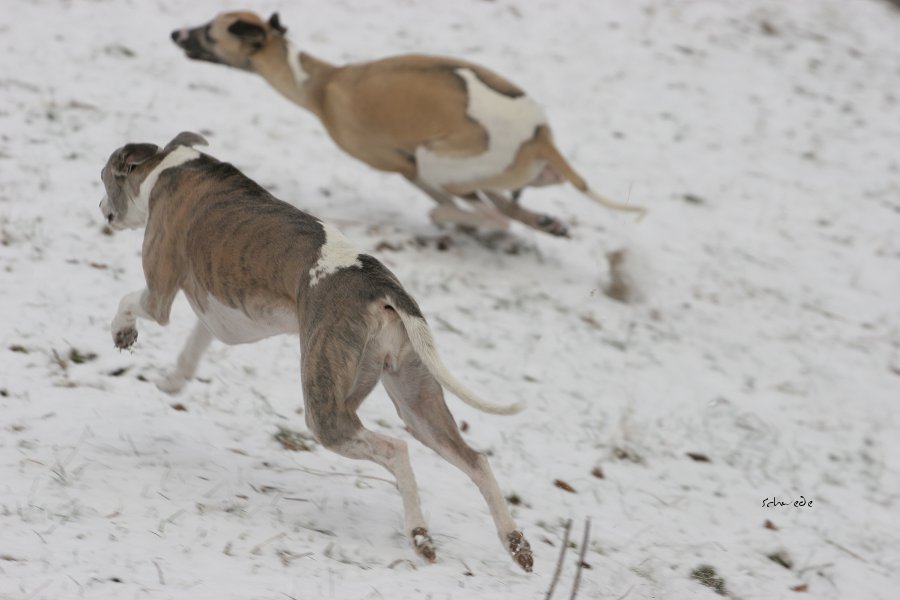 Kann es sein, dass mein seidenweicher Freund kurz vor seinem fünften Geburtstag tatsächlich erwachsen wird? Sein Verhalten ließe darauf schließen. Bolzt er aber mit Mono durchs Gelände, einfach so aus Spaß, dann benimmt er sich wie ein ausgelassener Welpe. Mono ist fürs Bolzen an sich ja immer zu haben, deshalb passt das ganz gut.