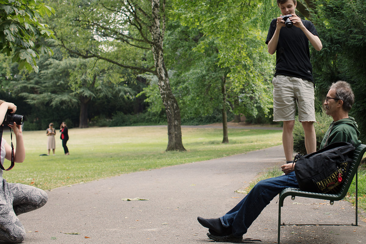 Alle 15 Schüler waren mit Feuereifer bei der Sache und sehr neugierig. Der eine oder andere hat mich sogar verblüfft. Bei der ersten praktischen Umsetzung der vorher gehörten Theorie hatte z.B. Antonia absolut keine Hemmungen, fremde Menschen anzusprechen und ihnen die Kamera wörtlich vor die Nase zu halten. Der nette Herr auf Bank (oben in der Galerie) ertrug sodann alle Experimente geduldig und freute sich sogar über die nette Gesellschaft. Die meisten sind schon mit der Technik gut vertraut und haben eine genaue Vorstellung, wie ihr visual storytelling aussehen wird. Ich bin sicher, dass sie am kommenden Donnerstag ein paar sehr interessante Fotostrecken zu bieten haben werden.