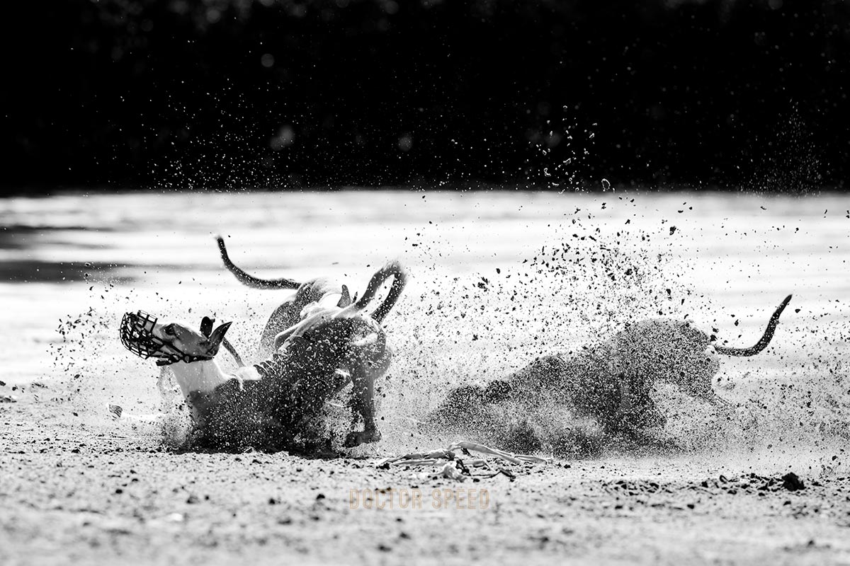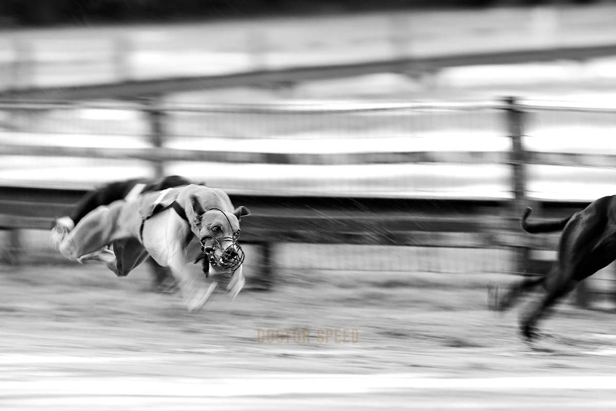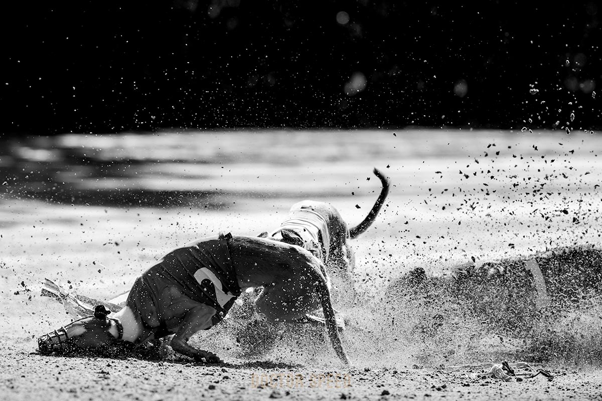 „Warum nicht?“ „Sie haben hier Gegenlicht.“ „Ja.“ „Sie haben Schlagschatten und die Hunde sind dann auf den Fotos ganz dunkel.“ „Ja.“ sagte ich wieder und wurde etwas ungeduldig, weil er mich ablenkte. Einen Lauf hatte ich wegen ihm schon verpasst und das Licht würde sich schnell ändern. „Sie müssen auf die andere Seite gehen.“ „Das ist nett, dass sie mir Ratschläge geben wollen, aber ich bleibe lieber hier. Danke!“ Kopfschüttelnd ging er zurück hinter die Hecke zu seiner Kamera und seinem Klappstühlchen. Soll er doch denken, dass ich einen an der Murmel habe, Hauptsache er lässt mich in Ruhe meine Fotos machen. Etwas aus dem Tritt gebracht widmete ich mich wieder den Hunden auf der Bahn.