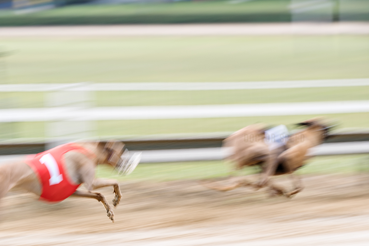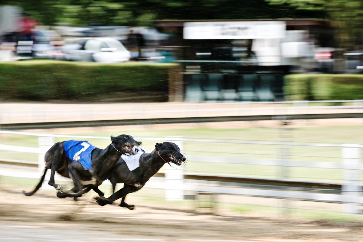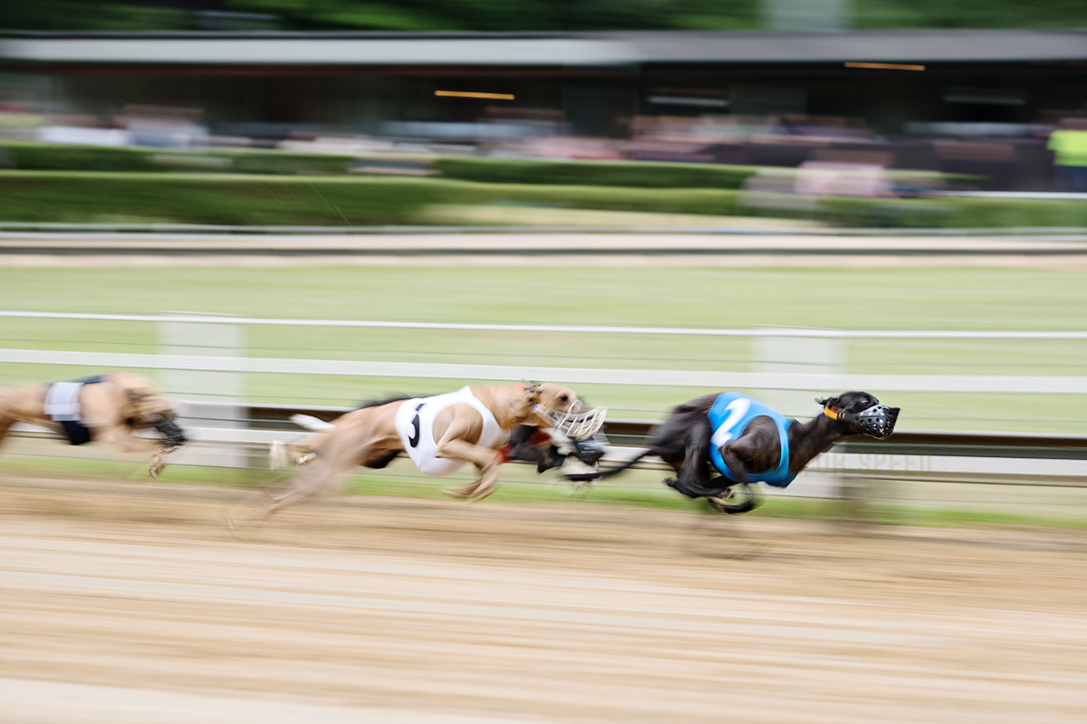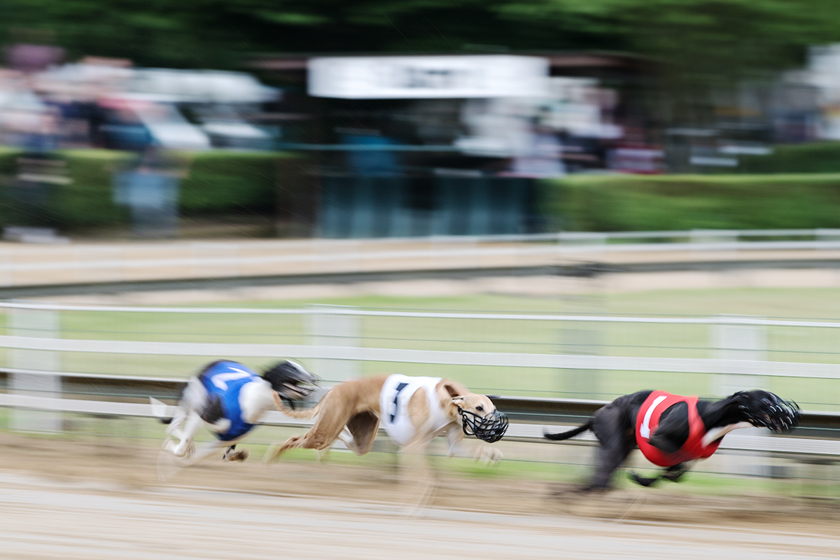 Würde ich an der Rennbahn noch frontale Schüsse machen – naja, hin und wieder aber immer seltener – nähme ich natürlich auf jeden Fall die 200er oder die 300er Festbrennweite. Aber an einigen Stellen der Gelsenkirchener Bahn sind sogar 200 Millimeter zu viel, um Gruppen zu erwischen. Einzelne Hunde immer, aber für ganze Gruppen ist es oversized. Deshalb ist das Zoom eine richtig gute Wahl für diesen Einsatzzweck.