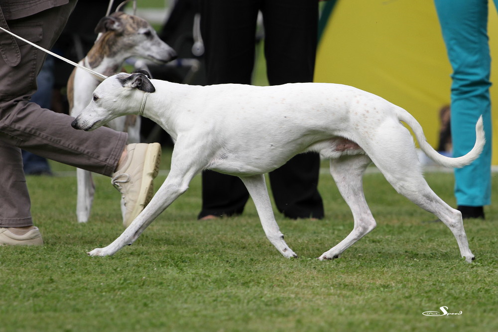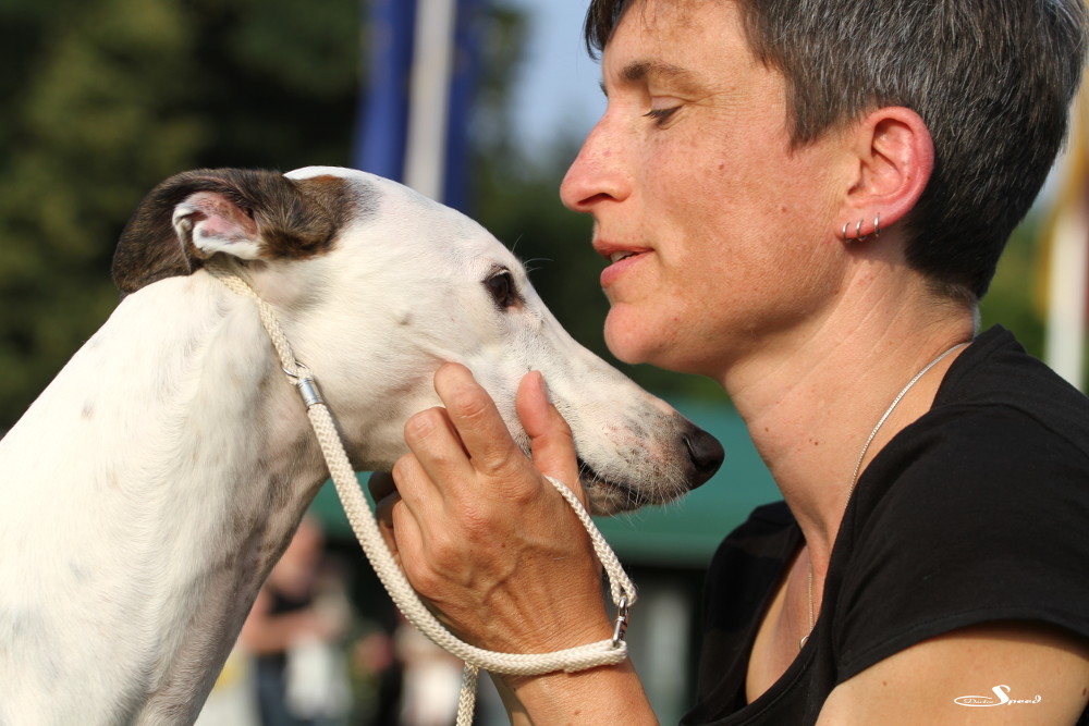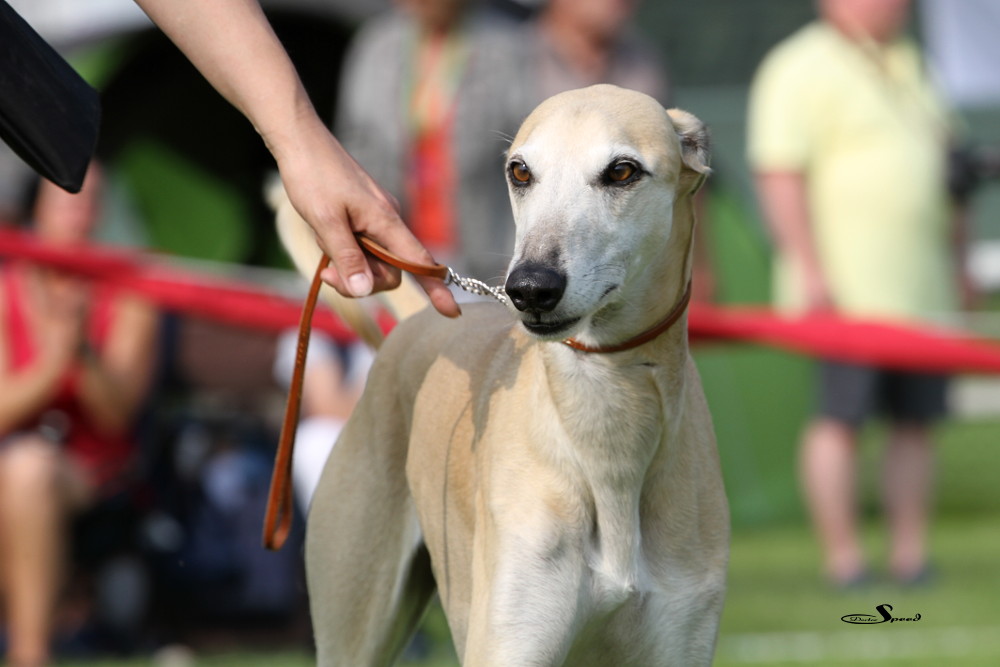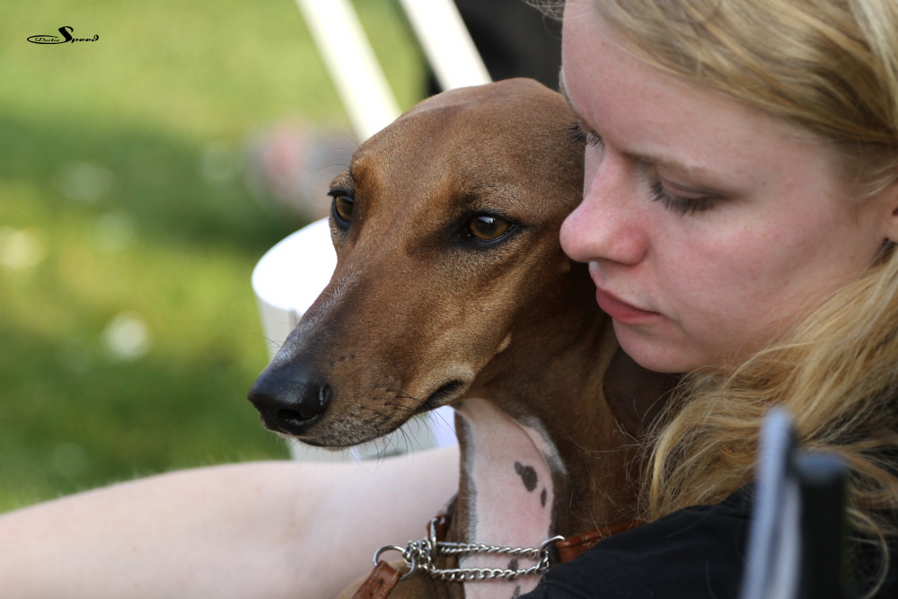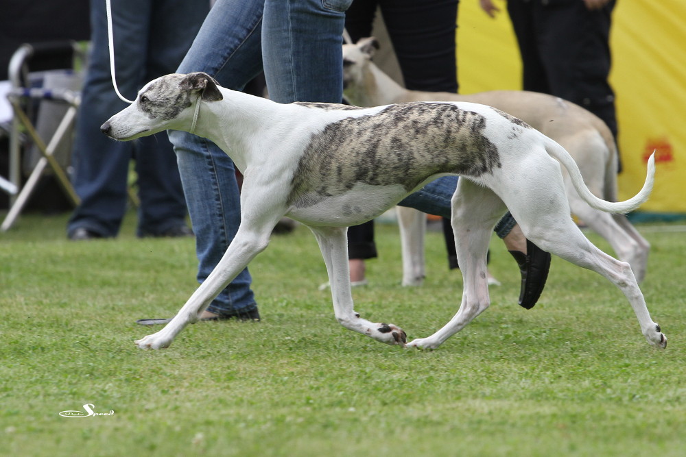 Doch zuvor musste gerichtet werden. Nach den Azawakhs und den Galgos nahm unsere Verbandspräsidentin Frau Wilfriede Schwerm-Hahne 56 Whippets unter die Lupe. Sie richtete zügig und im Zweifelsfall mit dem Körmaß. Letzteres setzte sie dann wie erwartete auch bei Mono an, der mit sechs anderen Rüden in der Offene Klasse stand. Er erhielt schließlich das V3 hinter Quebelle’s Arnoud und Koseilata’s Come With Me. Das CAC ging an Sylvianne’s Fabrice, Verbandssieger 2013 wurde Ch.Golden Peanut’s It’s My Dream aus der Siegerklasse. Das BOB ging an die schöne Light my Fire High On Emotion. Alle Ergebnisse gibt es wie immer beim DWZRV.