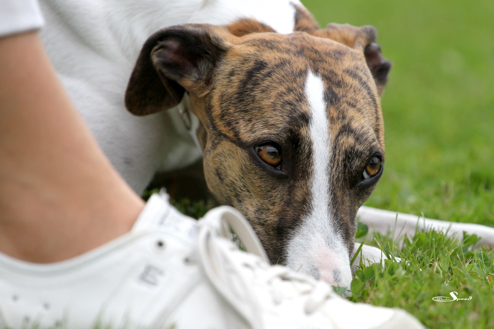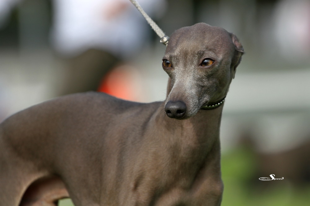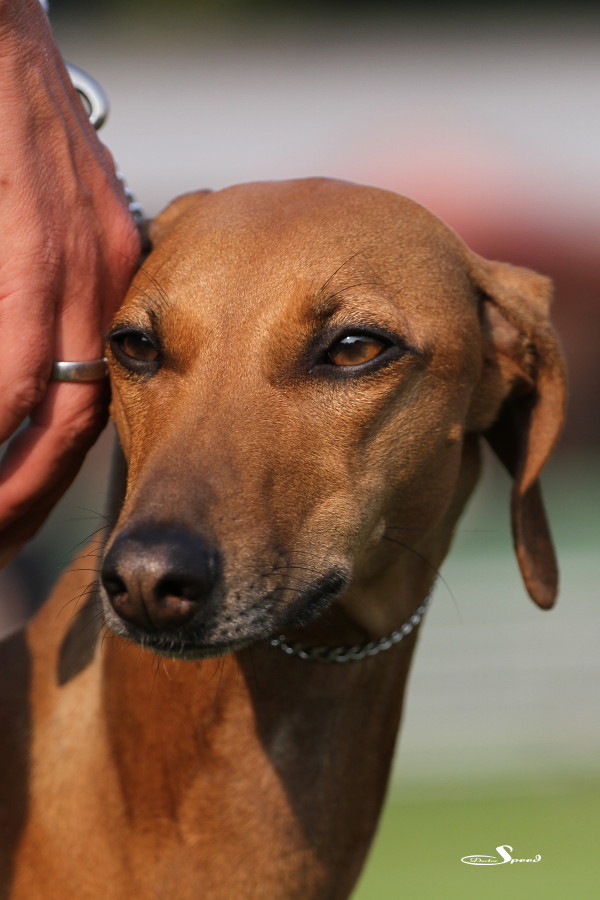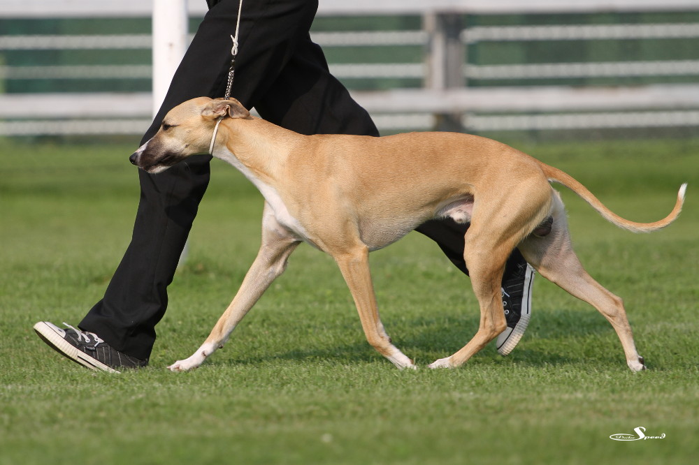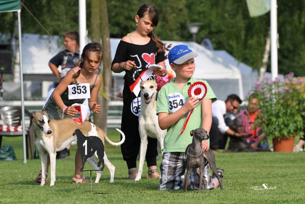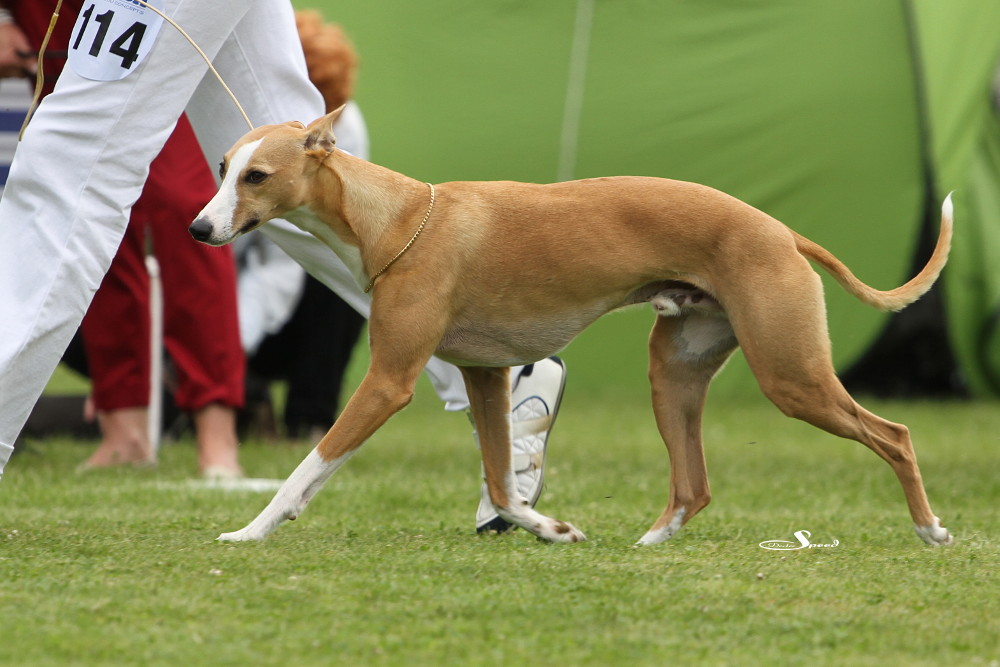 Doch zuvor musste gerichtet werden. Nach den Azawakhs und den Galgos nahm unsere Verbandspräsidentin Frau Wilfriede Schwerm-Hahne 56 Whippets unter die Lupe. Sie richtete zügig und im Zweifelsfall mit dem Körmaß. Letzteres setzte sie dann wie erwartete auch bei Mono an, der mit sechs anderen Rüden in der Offene Klasse stand. Er erhielt schließlich das V3 hinter Quebelle’s Arnoud und Koseilata’s Come With Me. Das CAC ging an Sylvianne’s Fabrice, Verbandssieger 2013 wurde Ch.Golden Peanut’s It’s My Dream aus der Siegerklasse. Das BOB ging an die schöne Light my Fire High On Emotion. Alle Ergebnisse gibt es wie immer beim DWZRV.