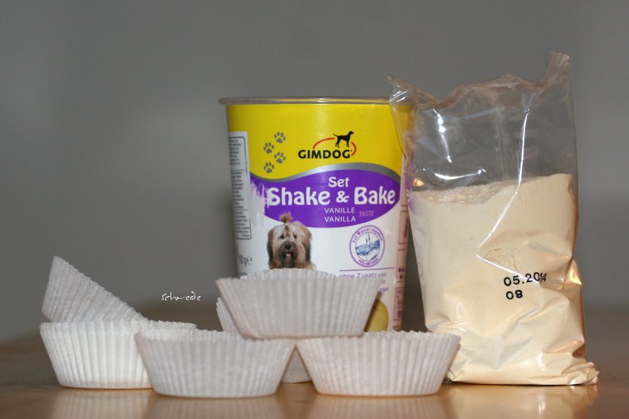 Für 3,99 Euro erwarb ich das Set zur Zubereitung der Muffins für den anspruchsvollen Hund. Inhaltsstoffe der Backmischung: Getreide, pflanzliche Nebenerzeugnisse, Eier und Eierzeugnisse, Mineralstoffe. Das ist nicht gerade präzise, liest sich auch nicht besonders poetisch, klingt dafür aber sehr klebrig. Ist es auch, wenn man Wasser ‚drauf kippt. Theoretisch könnte man die Rohmasse prima als Tapetenkleister mit Vanillearoma verwenden. Dann spart man sich auch gleich das Raumdeo.