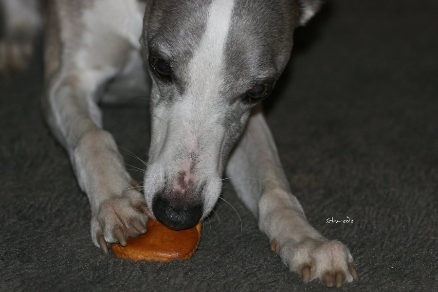 Ab und zu nehmen die Jungs auch andere politisch zutiefst inkorrekte Nahrung zu sich. Ganz ohne wertvolle Zusätze oder ähnlich wichtige Bestandteile. Eine Spielart unserer Belohnungskekse kostet 2,99 Euro das Kilo. Bei dem Preis können in den Goodies nicht mehr als Nebenerzeugnisse von Nebenerzeugnissen drin sein. Wenn überhaupt.