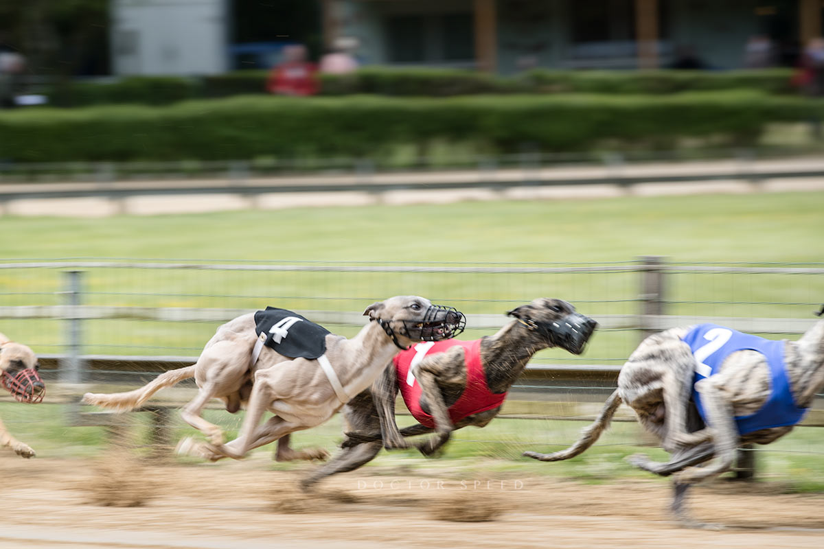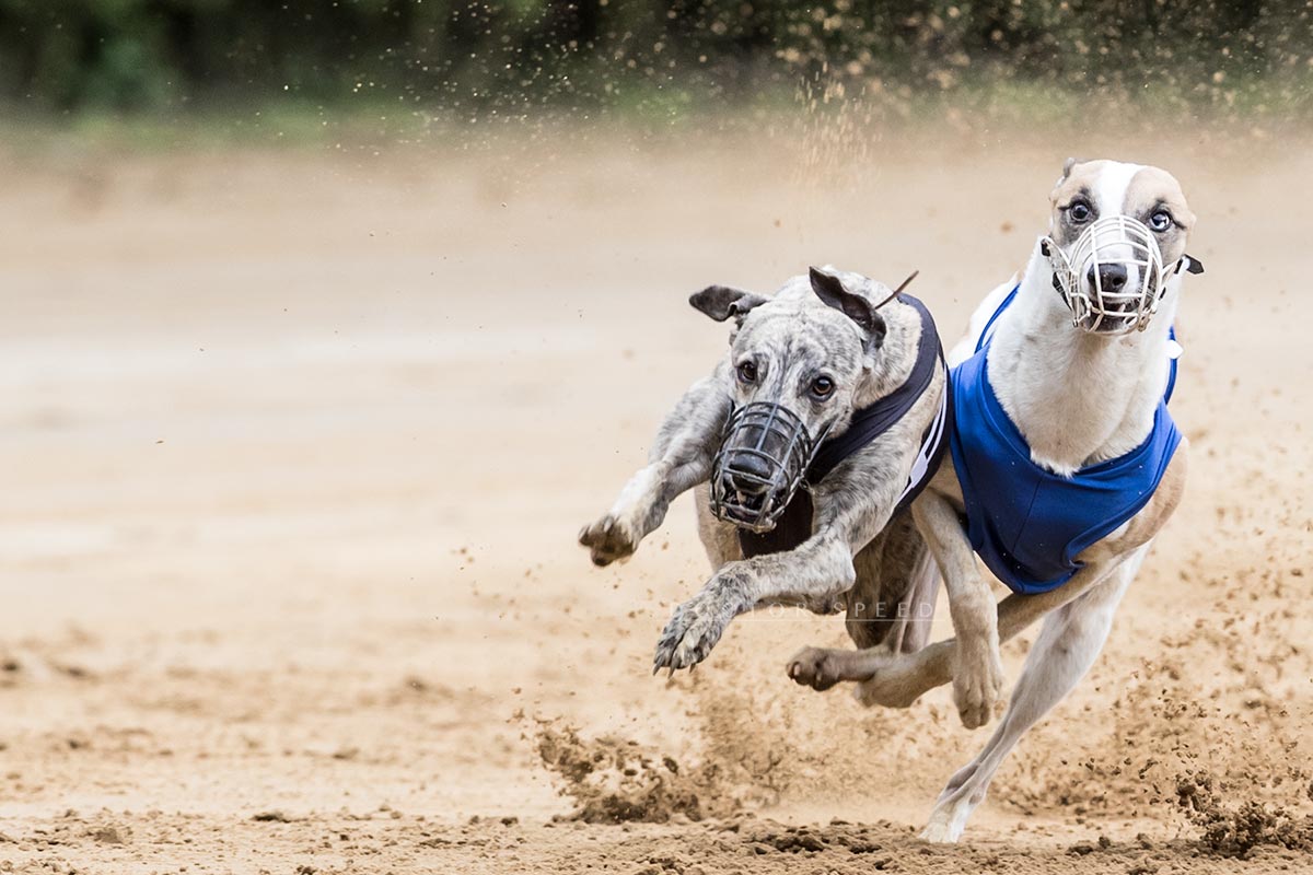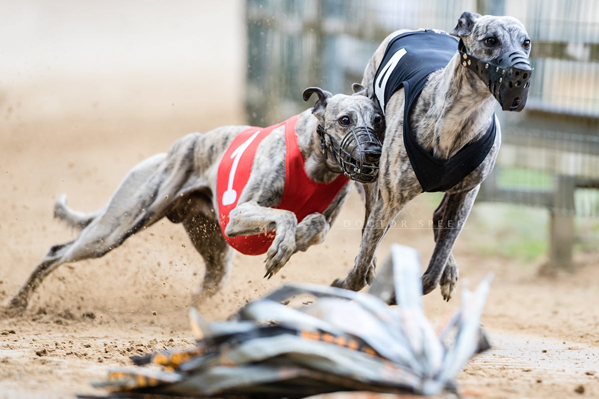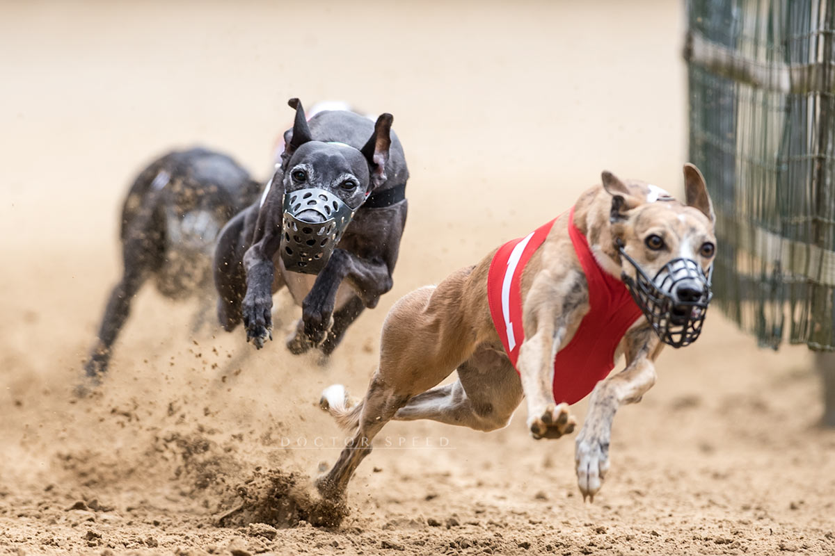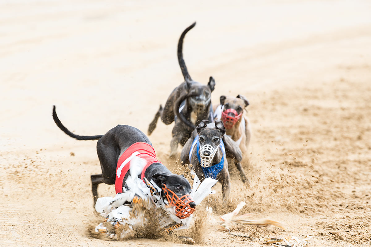 Schicke ich Mono ins Coursingtraining, dann bin ich in Sorge. Ich weiß, dass er das kann. Dennoch habe ich immer ein bisschen Angst um ihn. Das Seil, die Umlenkrollen? Aber er hat dort nur einen Laufpartner und viel Platz. Auf der Bahn laufen bei Titelrennen sechs Hunde im Vollspeed mit Körperkontakt. Da kann schonmal was schief gehen. Ich habe gesehen, wie eine Hündin im vollen Lauf mit einer Kralle in ihrem Maulkorb hängen blieb und sich überschlug wie ein Nascar nach einem Crash bei Tempo 300. Sie ist wieder aufgestanden, hat sich einmal geschüttelt und gut war’s. Gewissenhaft trainierte Whippet verpacken mehr, als man denken mag.