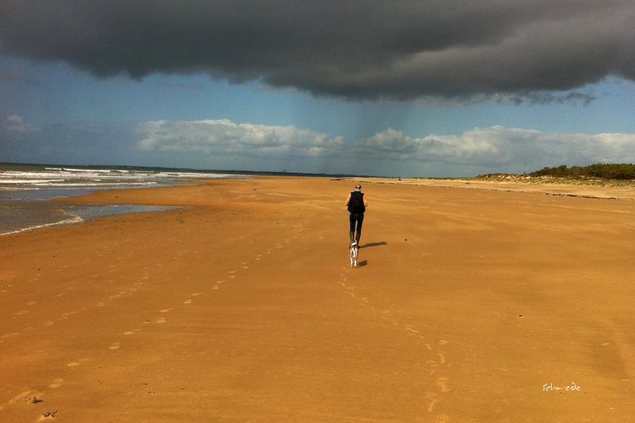 Lange hatten wir schon einen Plan, der sich in der Augusthitze wahnwitzig ausnähme. Von La Faute sur Mer wollten wir am Strand entlang bis zur Spitze der Landzunge, dem Point d’Arcay, laufen. Bei Tiefebbe und perfekten 16 Grad starteten wir mit leichtem Marschgepäck. Die Kamera ist schon lange zu einem neuen Körperteil geworden, Hundewasser, Wasser für uns und ein I-Phone wiegen im Grunde nichts. Mono und Mr.Clark drehten wie üblich in den Dünen kräftig auf, so dass ein halber Liter Hundewasser schon weg war, bevor wir überhaupt den Ozean erreicht hatten.