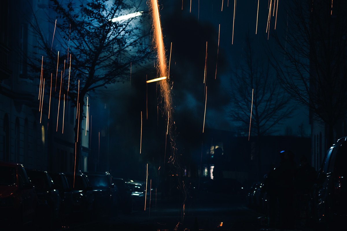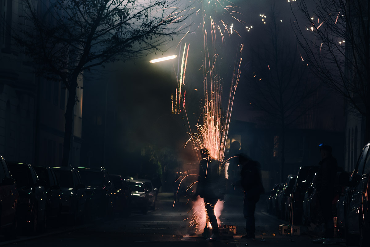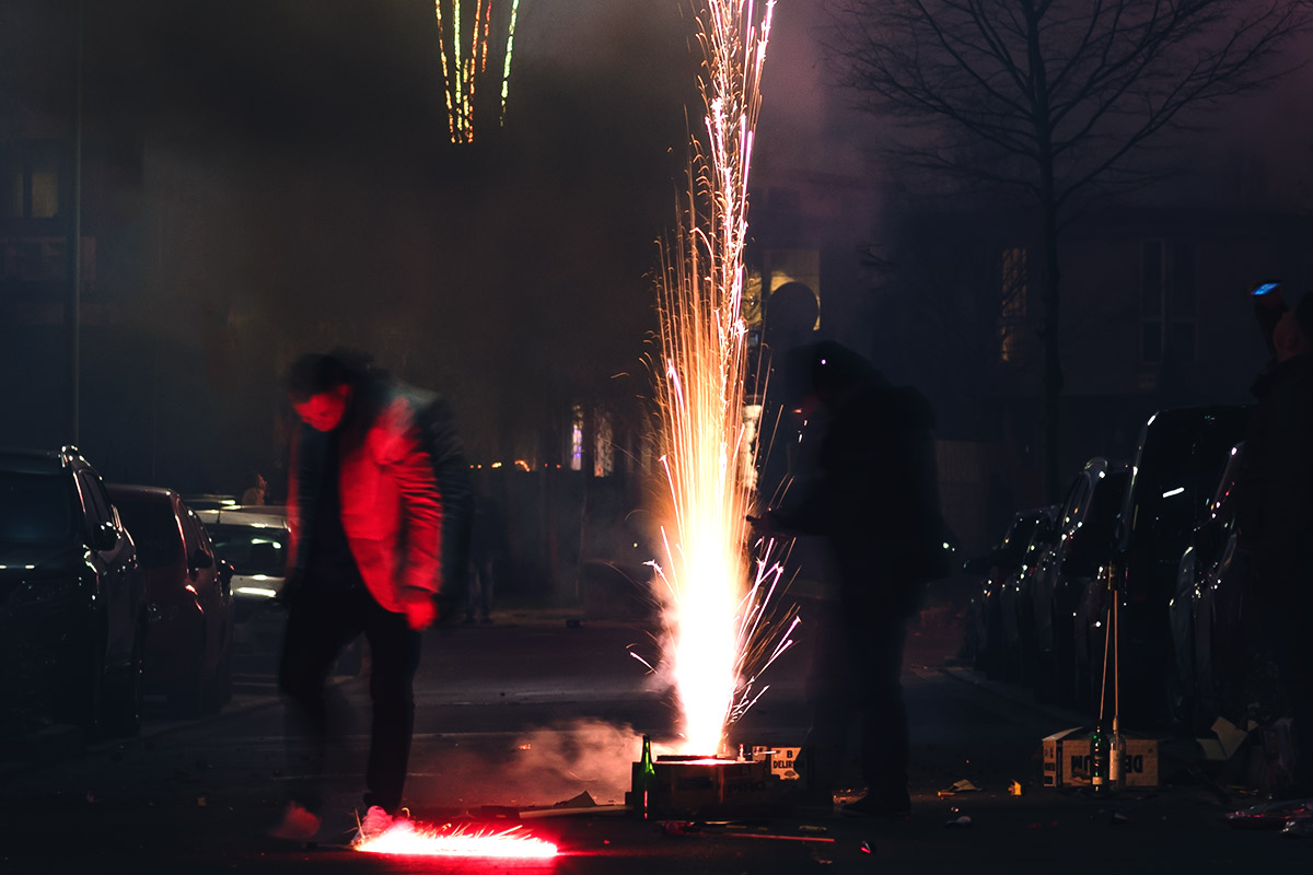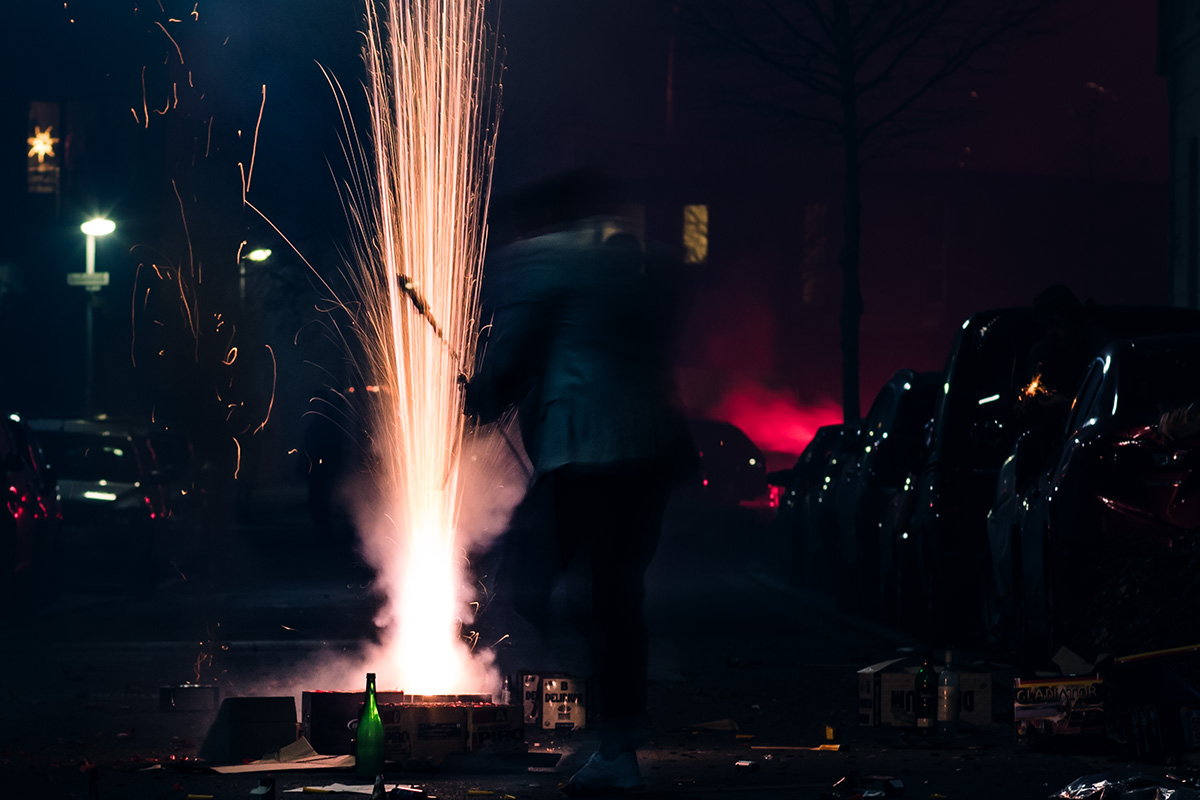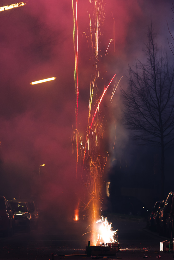 Die Fotografie an sich möchte ich allerdings in Zukunft thematisch deutlich weiter fassen. Flitzende Whippets sind toll, aber es gibt über sie hinaus noch so viel mehr Spannendes. Wie zum Beispiel unsere Nachbarn hier. Das sind nicht die von Halloween, aber sie sind ähnlich exzessiv in ihrer Art zu feiern. Sie hatten für die Silvesternacht so viel Pyrokram angeschleppt, dass sie ohne Probleme den Independence Day von Roland Emmerich hätten nachspielen können. Die Böllerbatterie Delirium schoss mit einem unglaublichen Getöse Lichtformationen gen Himmel, die den monströsen Todesstrahlen der Alienraumschiffe locker Konkurrenz machen konnten. Danke ihr verrückten Nachbarn! Ich bin ganz verliebt in die Fotos.