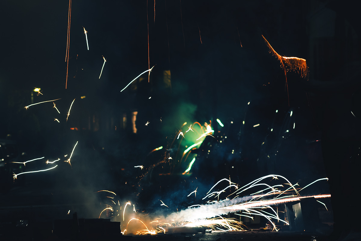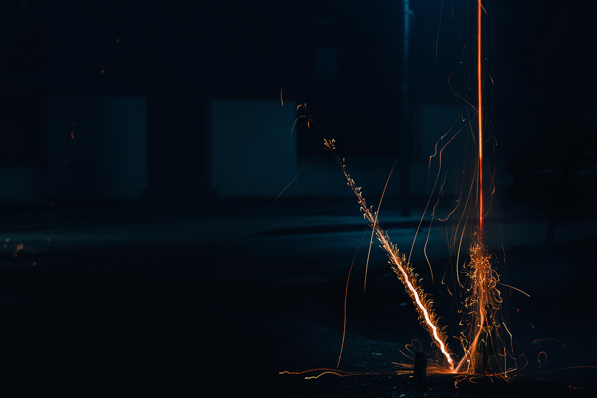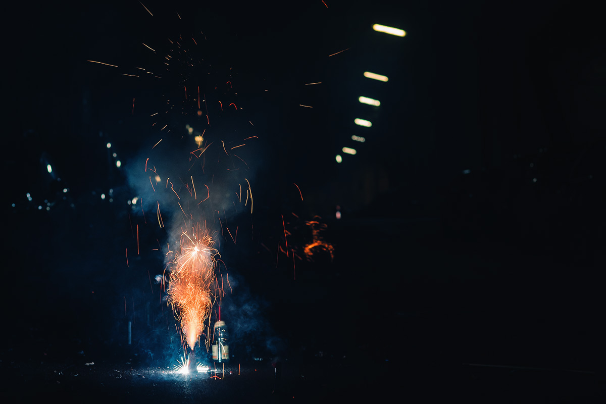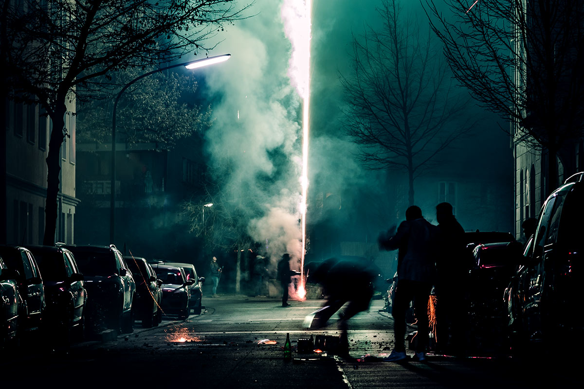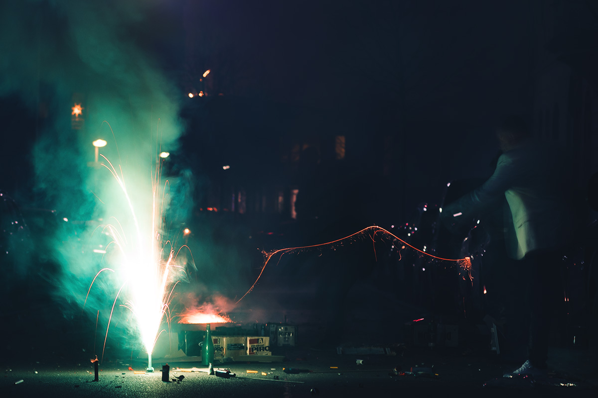 Die Fotografie an sich möchte ich allerdings in Zukunft thematisch deutlich weiter fassen. Flitzende Whippets sind toll, aber es gibt über sie hinaus noch so viel mehr Spannendes. Wie zum Beispiel unsere Nachbarn hier. Das sind nicht die von Halloween, aber sie sind ähnlich exzessiv in ihrer Art zu feiern. Sie hatten für die Silvesternacht so viel Pyrokram angeschleppt, dass sie ohne Probleme den Independence Day von Roland Emmerich hätten nachspielen können. Die Böllerbatterie Delirium schoss mit einem unglaublichen Getöse Lichtformationen gen Himmel, die den monströsen Todesstrahlen der Alienraumschiffe locker Konkurrenz machen konnten. Danke ihr verrückten Nachbarn! Ich bin ganz verliebt in die Fotos.