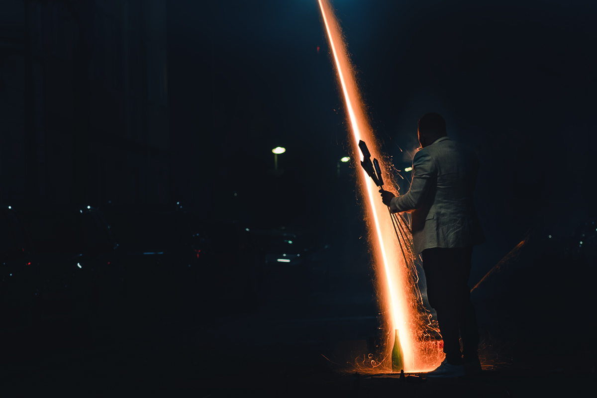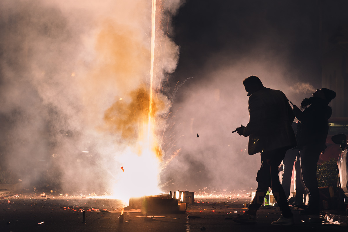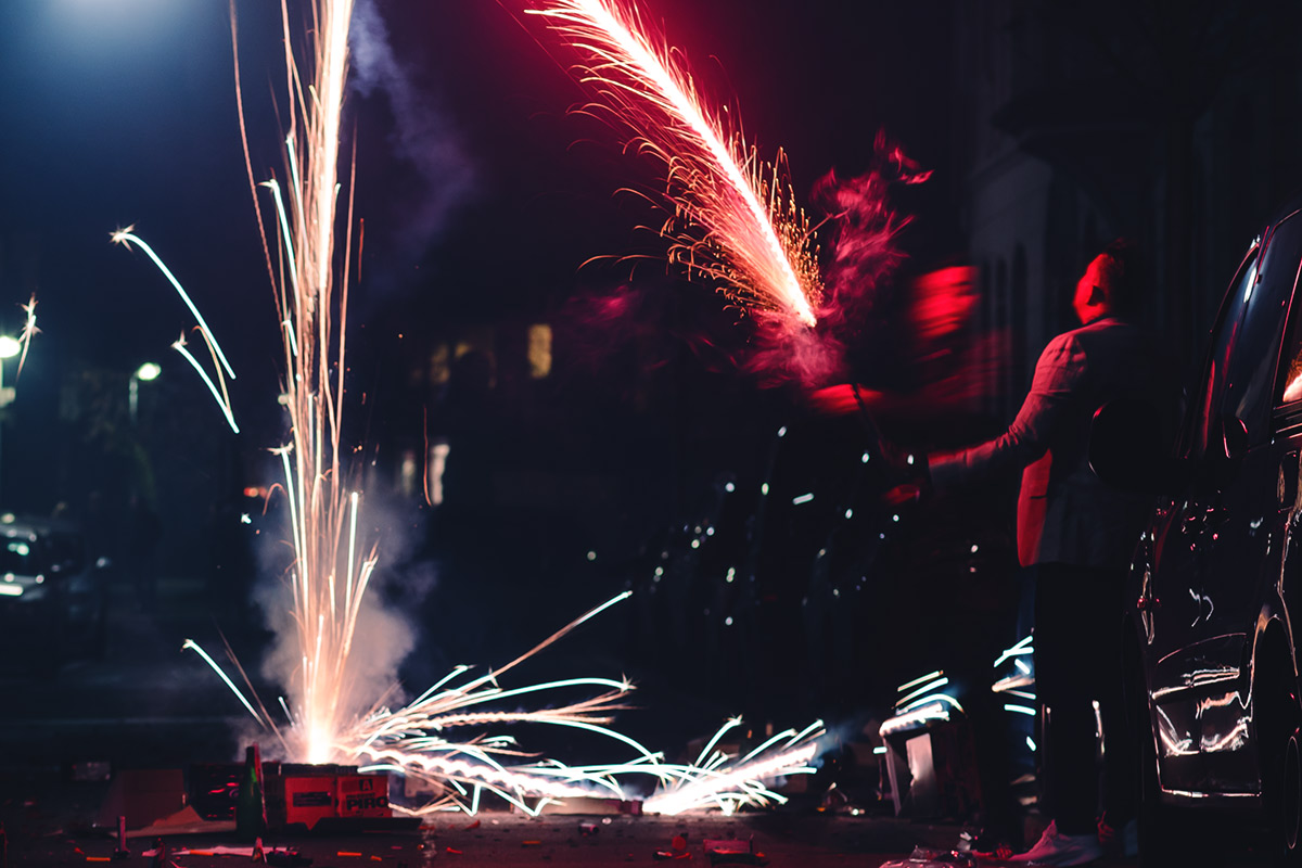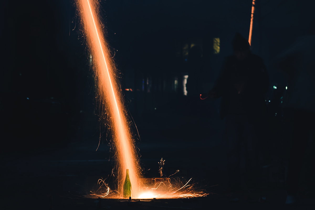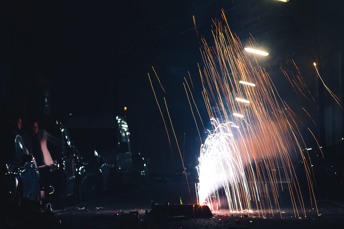 Die Fotografie an sich möchte ich allerdings in Zukunft thematisch deutlich weiter fassen. Flitzende Whippets sind toll, aber es gibt über sie hinaus noch so viel mehr Spannendes. Wie zum Beispiel unsere Nachbarn hier. Das sind nicht die von Halloween, aber sie sind ähnlich exzessiv in ihrer Art zu feiern. Sie hatten für die Silvesternacht so viel Pyrokram angeschleppt, dass sie ohne Probleme den Independence Day von Roland Emmerich hätten nachspielen können. Die Böllerbatterie Delirium schoss mit einem unglaublichen Getöse Lichtformationen gen Himmel, die den monströsen Todesstrahlen der Alienraumschiffe locker Konkurrenz machen konnten. Danke ihr verrückten Nachbarn! Ich bin ganz verliebt in die Fotos.