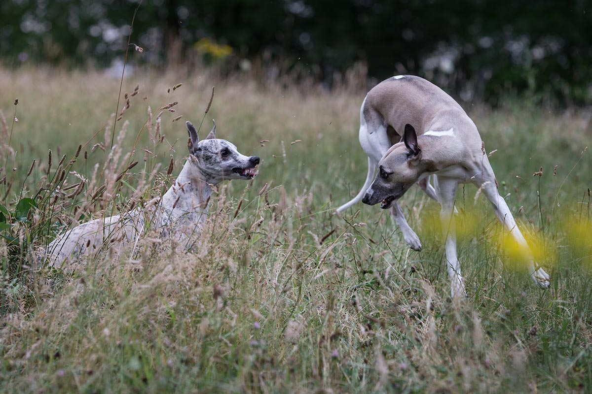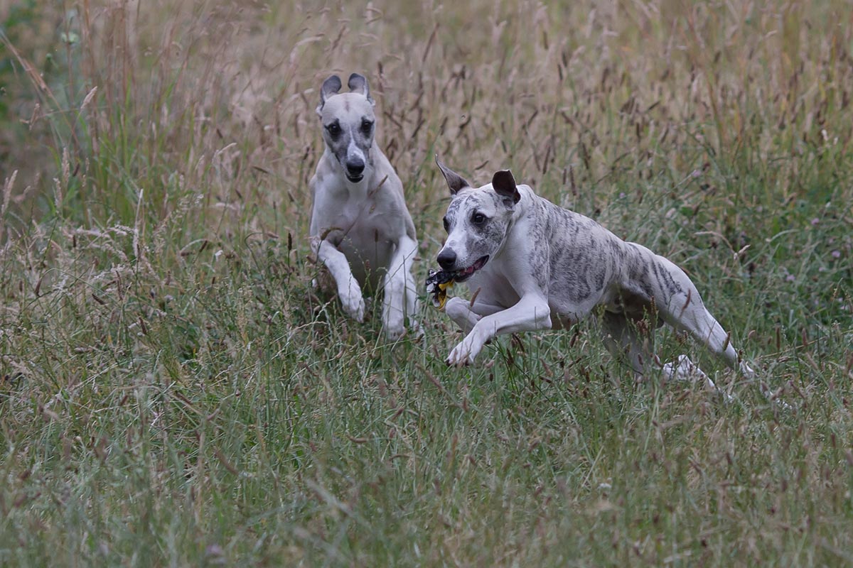 Der Samstag wurde tatsächlich noch schlimmer. Doch jetzt haben wir ihn überstanden. Wir sind nicht alle draufgegangen, obwohl Danny mir die Möglichkeit tagelang versucht hat zu kommunizieren. Heute kamen die Gewitter und brachten ein wenig Abkühlung. Endlich! Und natürlich kann man bzw. können zwei Whippets dann wieder von Null auf Hundert komplett hohl drehen.