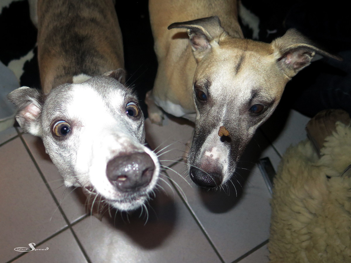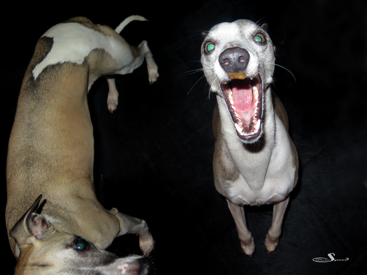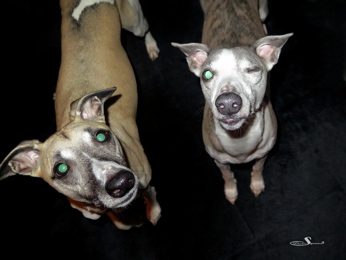 Der Rote-Augen-Filter der G16 kämpft gegen die im Blitz grün reflektierende Whippetaugen natürlich vergeblich. Sie blieben auch so, denn eine Retusche sähe in diesem Licht sehr unrealistisch aus und nähme den Fotos den Gag.