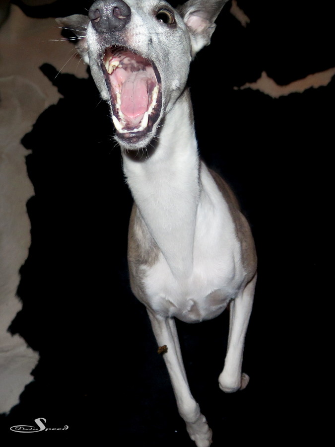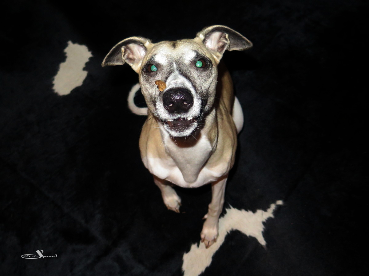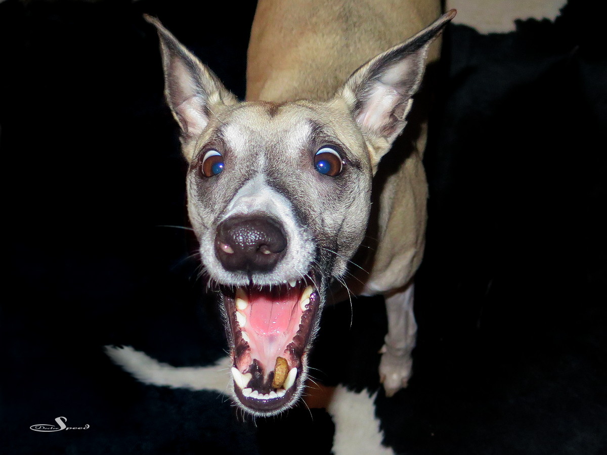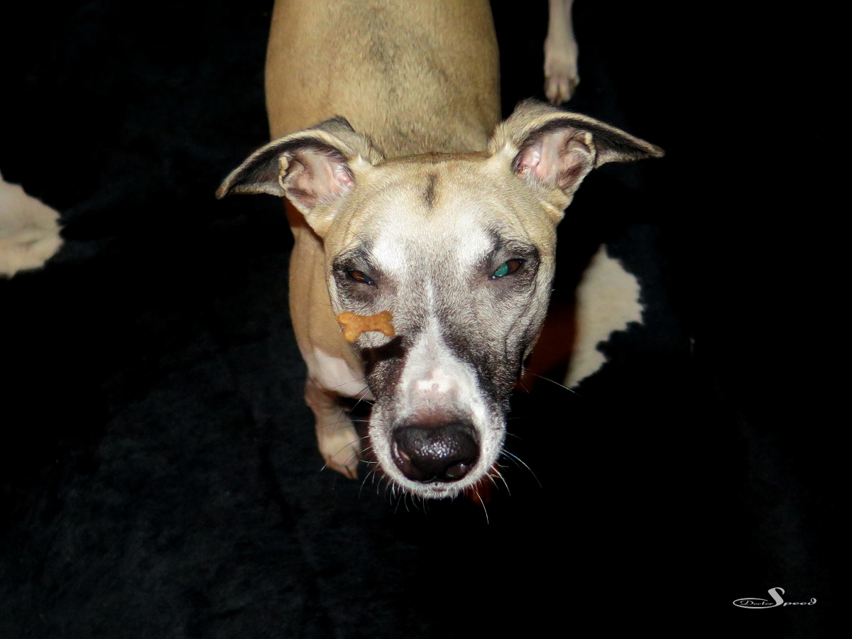 Der Rote-Augen-Filter der G16 kämpft gegen die im Blitz grün reflektierende Whippetaugen natürlich vergeblich. Sie blieben auch so, denn eine Retusche sähe in diesem Licht sehr unrealistisch aus und nähme den Fotos den Gag.