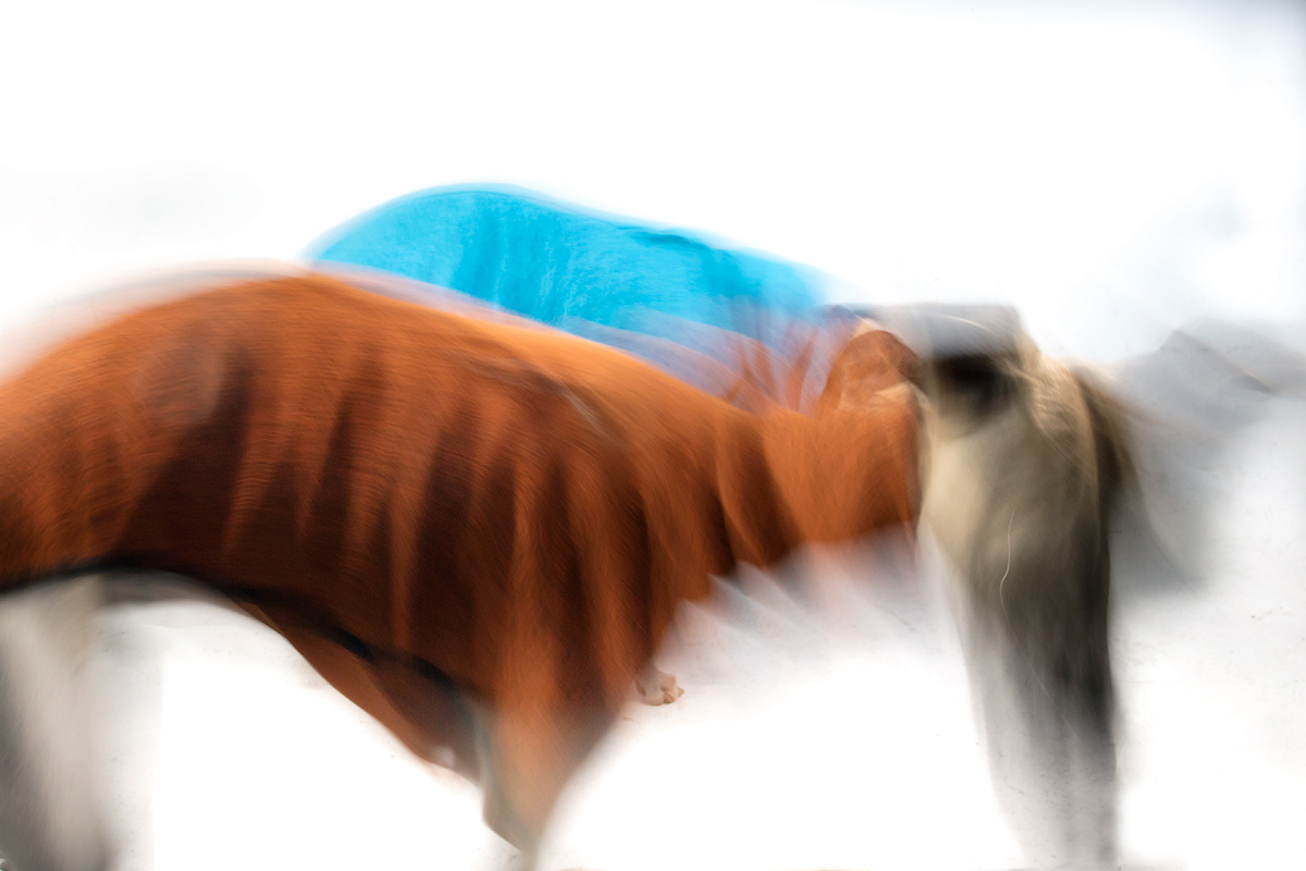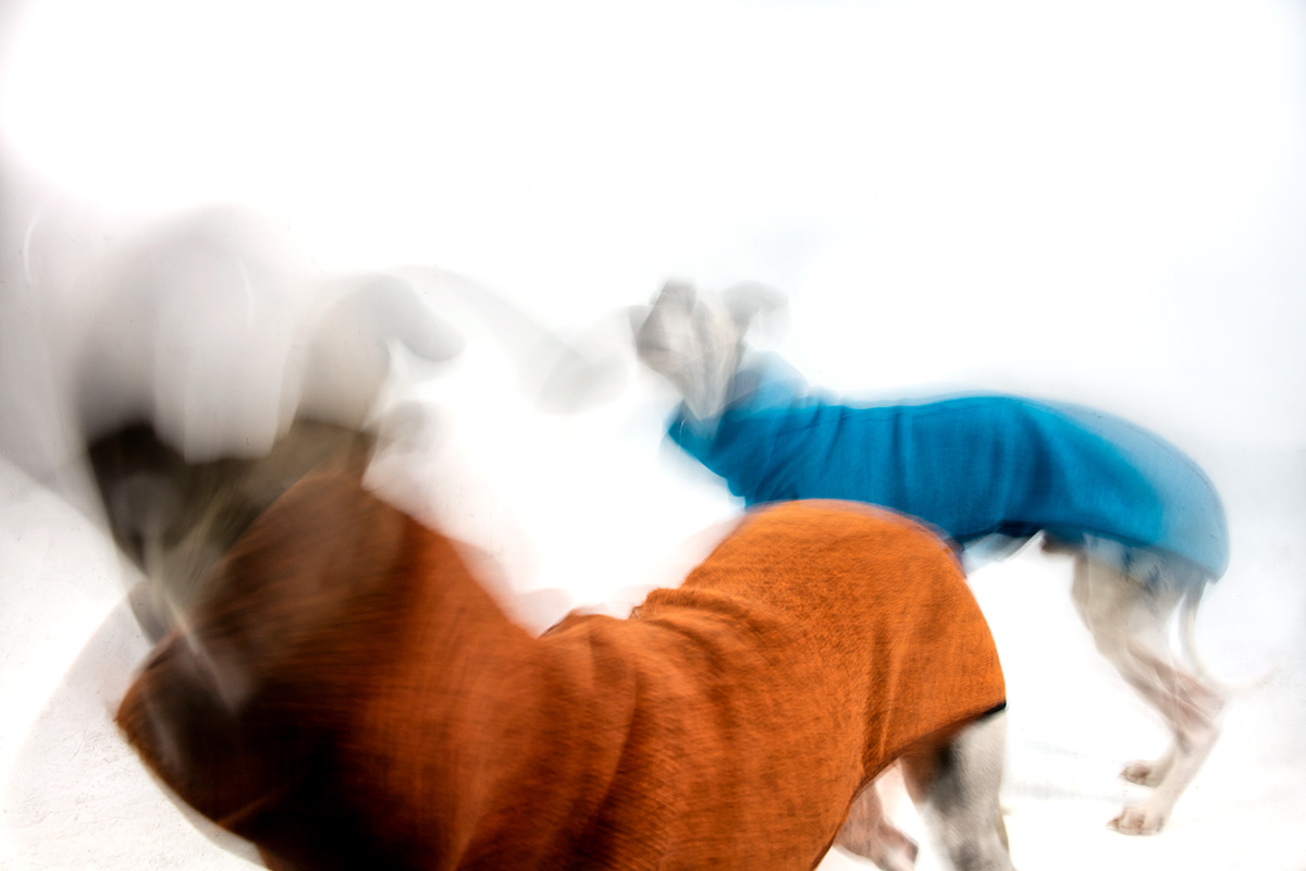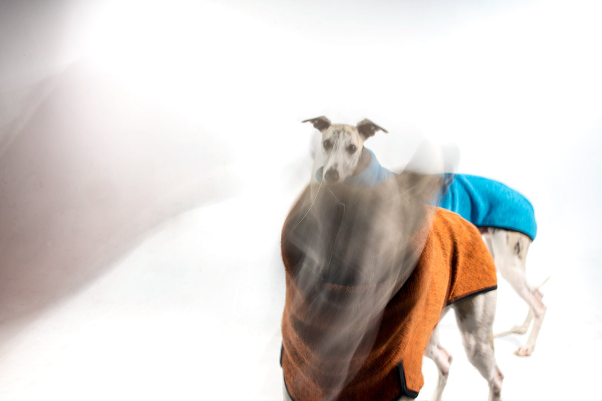 Wie soll ich denn mit dem angemessenen Ernst meiner Arbeit nachgehen, wenn zwei Whippets nicht wie befohlen auf ihrer Decke liegen, sondern in ihren muckeligen Pullöverchen fröhlich vor meiner Nase sprich vor der Linse herumtanzen?