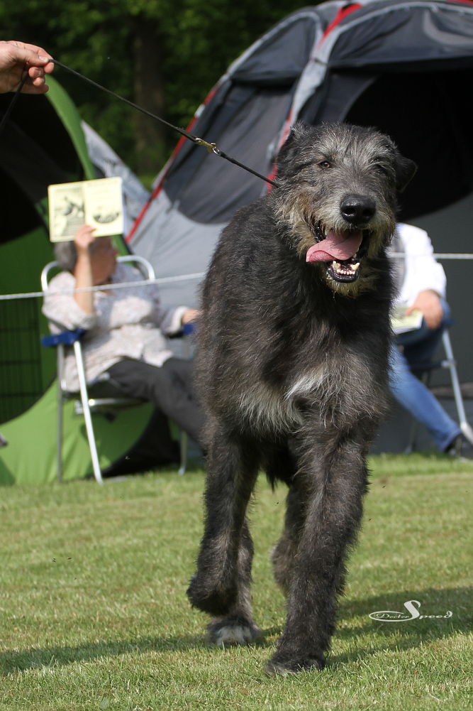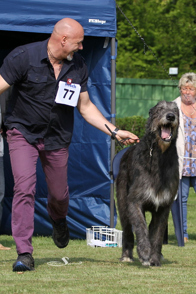 Es war im Mai 2013 an einem ungewöhnlich heißen Tag beim WRV Duisburg/Hochdahl, als mir angesichts dieses Giganten der Mund offen stehen blieb. So einen großen und mächten Wolf hatte ich nie zuvor gesehen. Um so überraschter war ich dann über die Leichtfüßigkeit, mit der er trotz der Temperaturen den Ring durchschritt. Das lag bestimmt auch an der guten Laune, die sein Besitzer Gary Janssens aus Belgien mitgebracht hatte. In meinen Augen ein tolles Paar, an das man sich einfach erinnern muss!