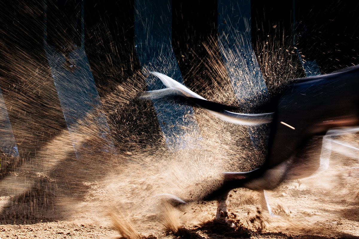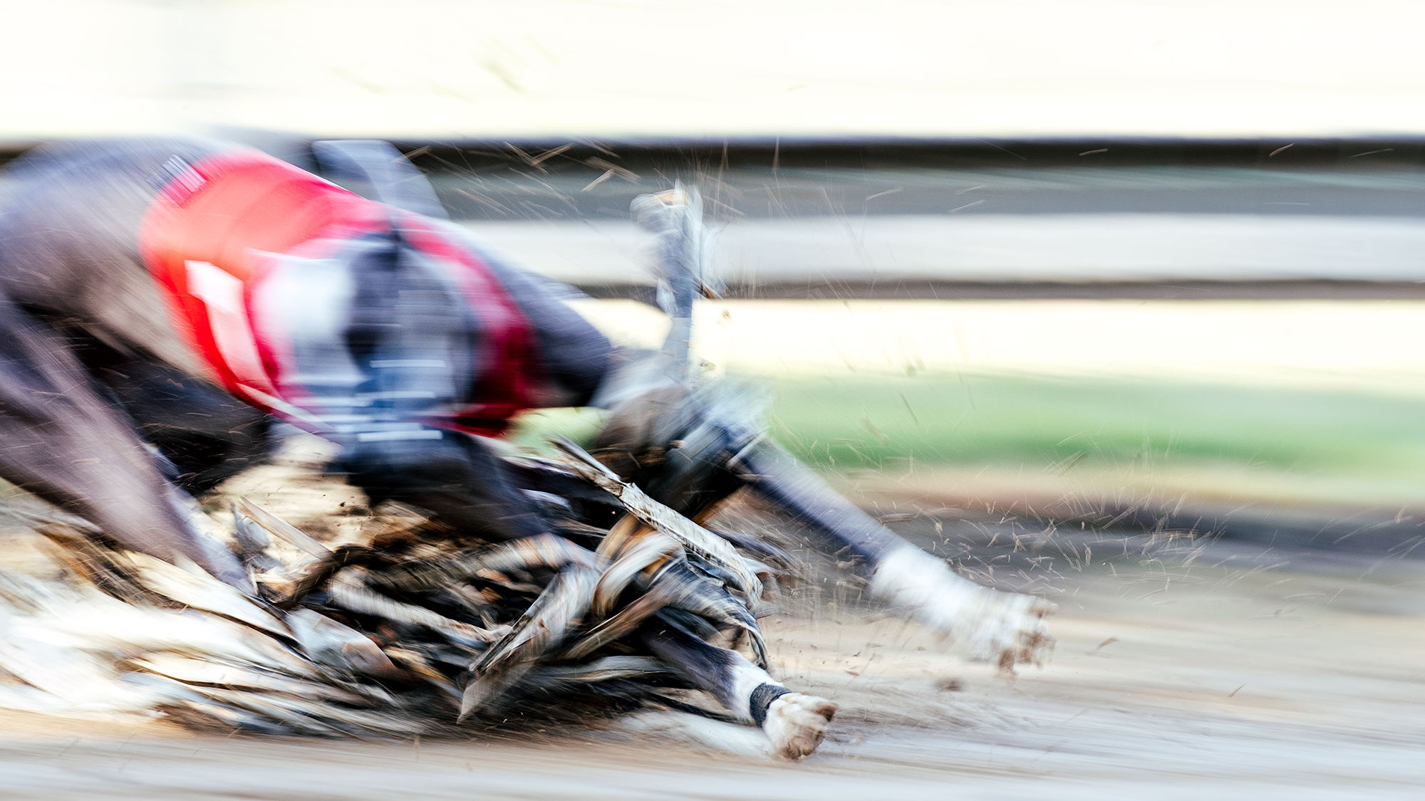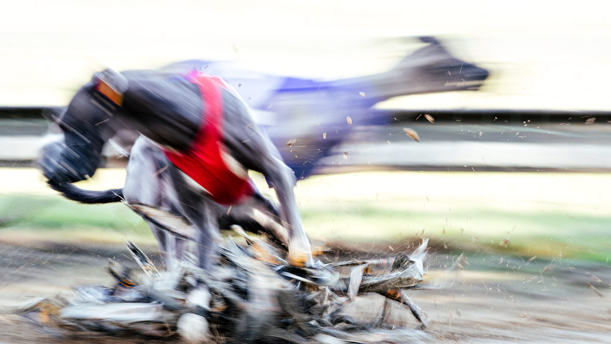 Wie immer empfing mich gleißendes Gegenlicht in der Treckerkurve, also die Kurve vor dem 480- Meter-Startkasten. Der Sand war nass und ich froh, an ein kleines Sitzkissen gedacht zu haben. Ich wusste, was mich erwartet: Aus rasenden Silhouetten stößt der heiße Atem. In der Sonne materialisiert er sich zu Wolken aus Millionen glitzernder Tropfen. Zahnreihen zeichnen zackige Muster. Maulkorb bewehrte Wesen fliegen vorbei wie Streitrösser aus einer fernen Galaxie.