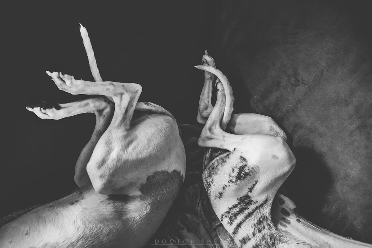 In der ersten Etage sehe ich dann ganz hinten im Gegenlicht die annoncierten Whippets. Ich gehe vorbei an den obligatorischen Labradoren – in allen Farben zu haben – , Akita Inus, ich glaube Samojeden, Border Collies, Australien Cattle Dogs. Drei Whippets, zwei schwarze und ein roter spielen in ihrem Gehege. Ein vierter schwarzer käbbelt im Nachbargehege mit einem Bordercollie ums Futter. „Groß!“, denke ich. „Gerade vier Monate alt und fast so groß wie Danny!“, dachte ich. „Und sehr dicke Wachstumsknubbel.“ Ich beschließe für mich, dass diese Welpen ganz sicher keine Whippets sind, sondern Greyhoundmischlinge. Rennwhippetlinie – Renngreylinie. Sie haben keine Whippetköpfe sondern Greyhoundköpfe. Für Whippets dieses Alters sind sie viel, viel zu groß. An ihrem Gehege haben sie einen kleinen Balkon, auf dem sie auf und ab laufen können. Aber sie wissen nicht, dass sie ihre Beine auch strecken könnten.