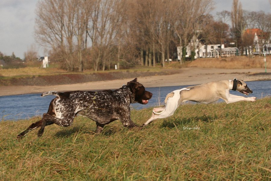 Er lernt: Lasse Deinen Whippet nach Möglichkeit nicht mit großen Hunden rennen.