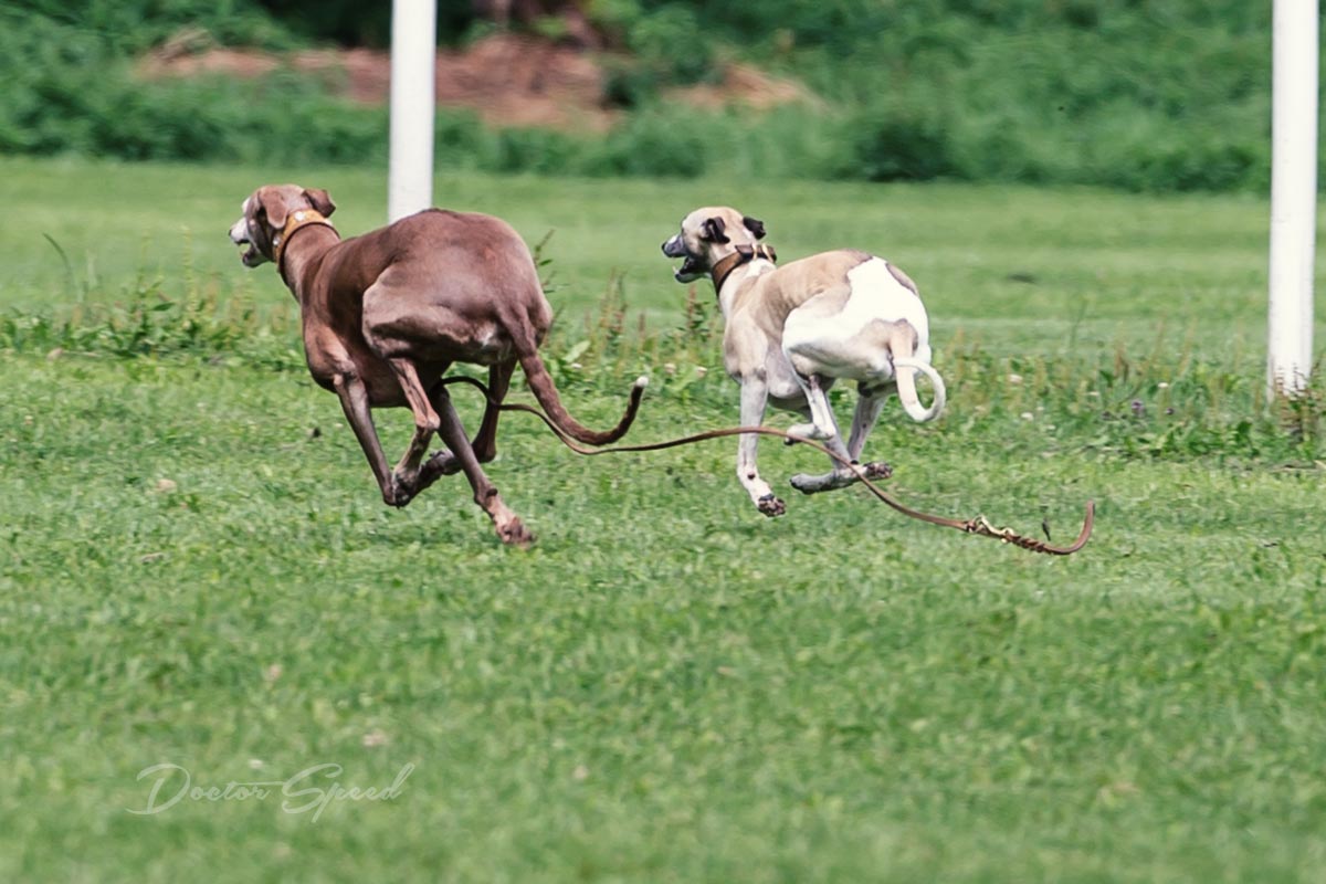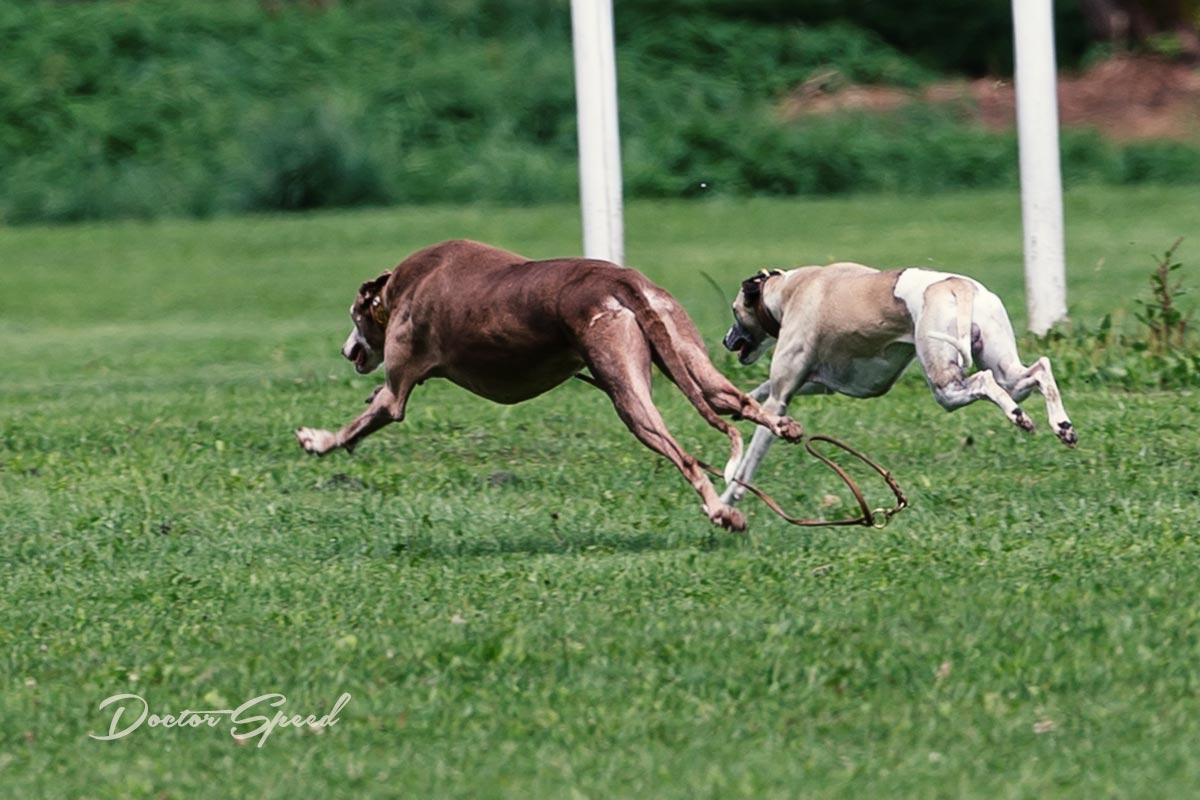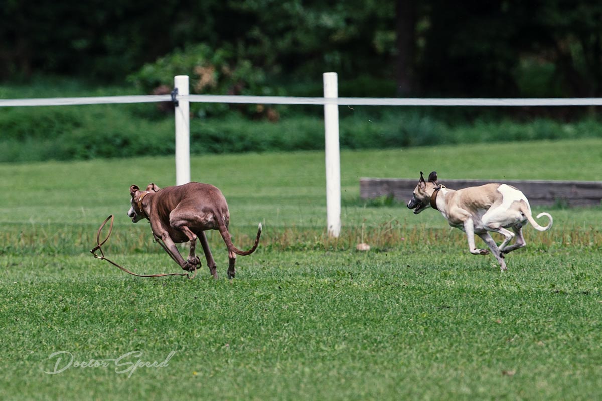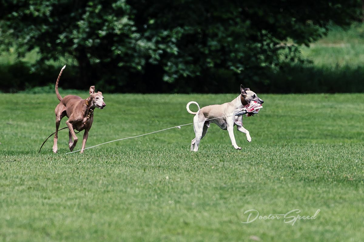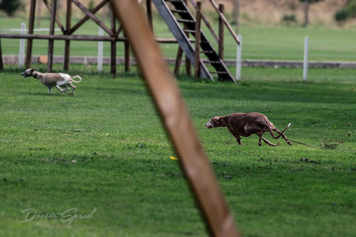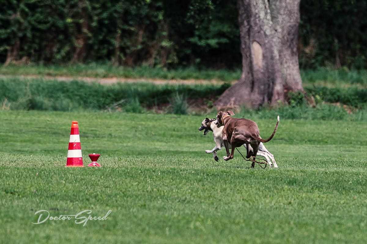 Ich wusste genau, dass Mono nicht panisch wird. Er wich der Hündin aus, indem er kurz unter der Absperrung durchtauchte. Dann zündete er seinen Turbo, kam zurück, überholte die Hündin außen und warf sich – wie üblich – fliegend und ohne zu bremsen auf den Hasen. Die Grey-Hündin blieb zum Glück einfach stehen und guckte verwirrt in die Gegend. Ich schnappte mir den Hasen und legte ihn – wie vorher abgemacht – für den nächsten Läufer neu aus. In dieser Zeit hatte sich die Besitzerin der Greyhound Hündin still und leise aus dem Staub gemacht.