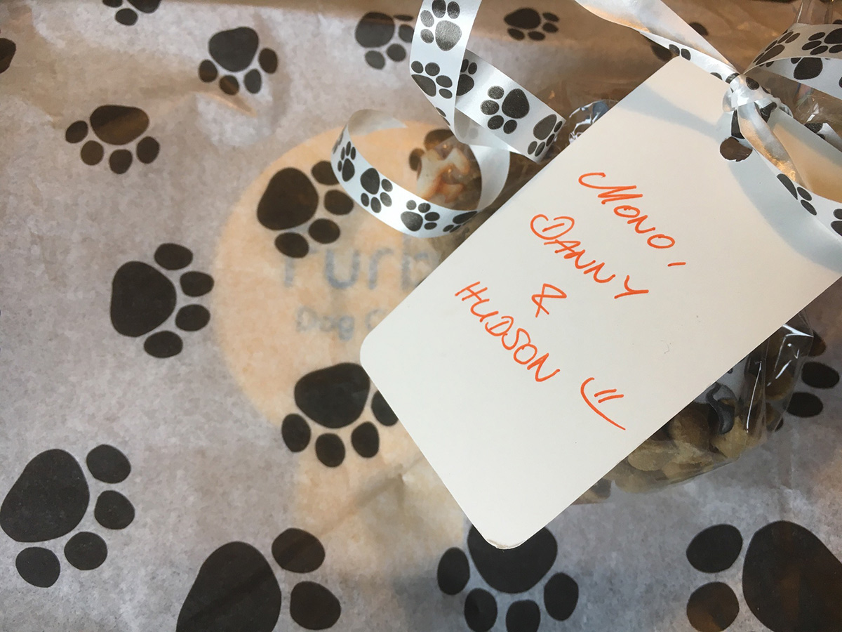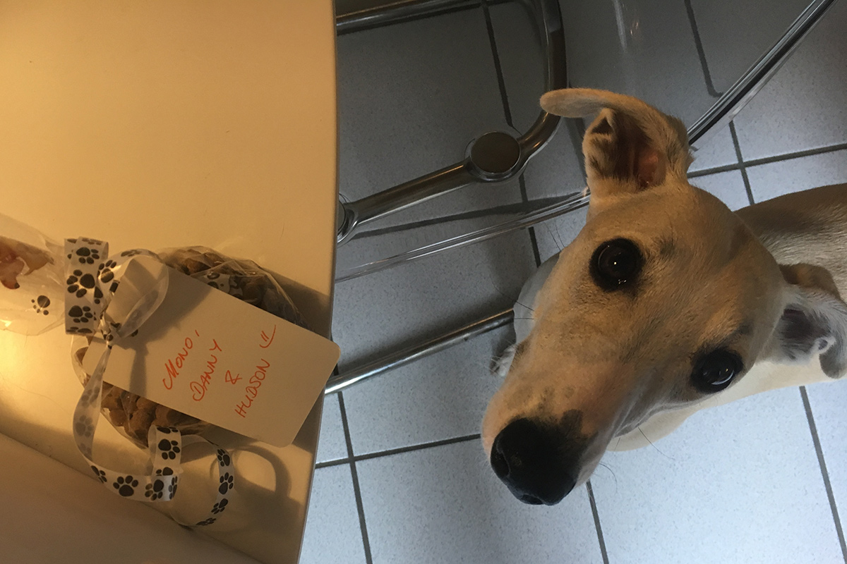 Zum Fotografieren stellte ich Furbo auf den Boden. Ich robbte auf dem Bauch herum und versuchte genau den Moment zu erwischen, in dem die Leckerchen geflogen kommen. Hudson lag die ganze Zeit sehr aufmerksam neben mir. Nach jedem Versuch sammelte er eilig alles ein, was er finden konnte. Gedanklich strich ich sein Abendessen. Wie oben links auf dem Foto gut zu sehen, hält Mono grundsätzlich nichts davon, für sein Futter arbeiten zu müssen.