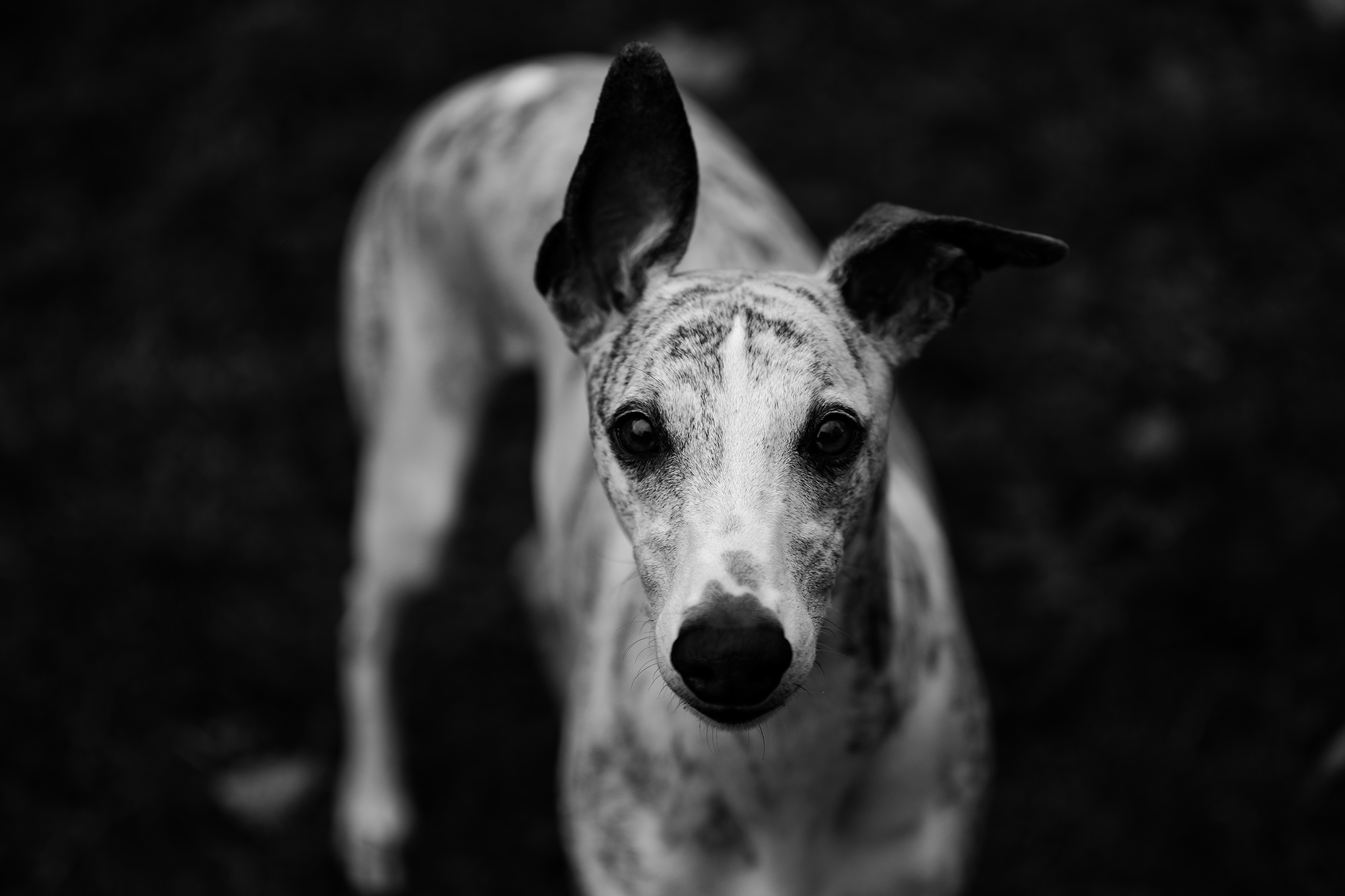 Portraits von meinen Whippets. Danny schaut mich an. Seine recht runden Augen verleihen ihm nach wie vor einen recht kindlichen Blick.