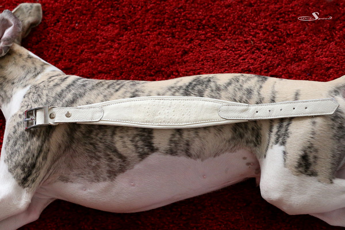 Dannys Hals ist noch zu klein für sein weißes Geschmeide. Doch die Zeit wird kommen. Bis dahin kann Mono es schon einmal eintragen. Ich werde mal gucken, ob ich dazu eine cremefarbene Lederleine bekomme. Ja, auch ich darf mal oberflächlich sein und mich an schönen Dingen erfreuen. Und hätte ich einen Hund, zu dem diese Farbe passt, dann wäre auch Elfies türkises Drachenhalsband aus Tilapia in meinem Paketchen gelandet. Aber auf ihren schwarzen Fell sieht es einfach gigantisch aus.