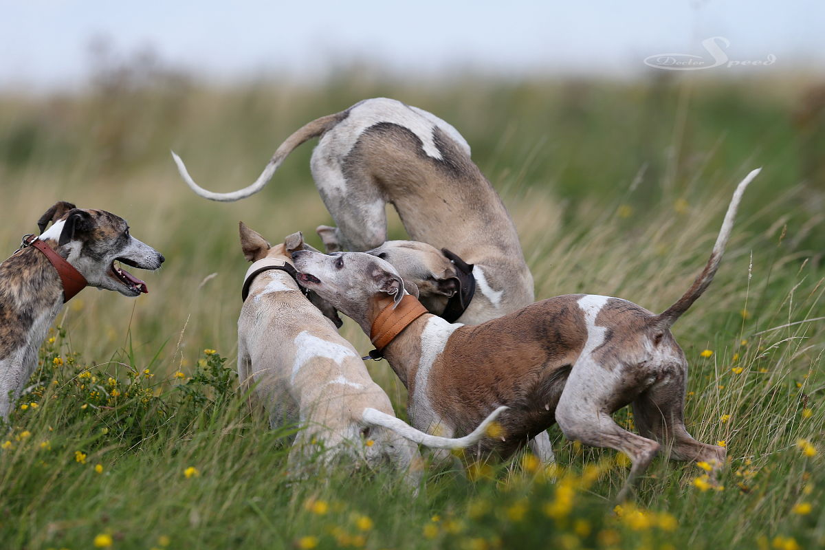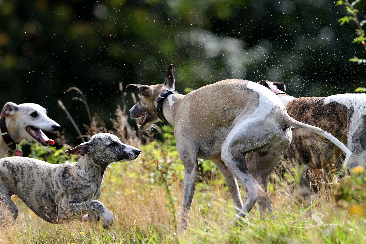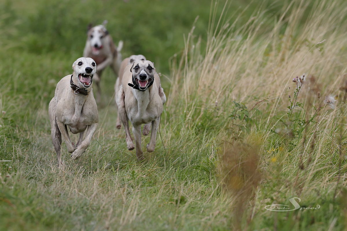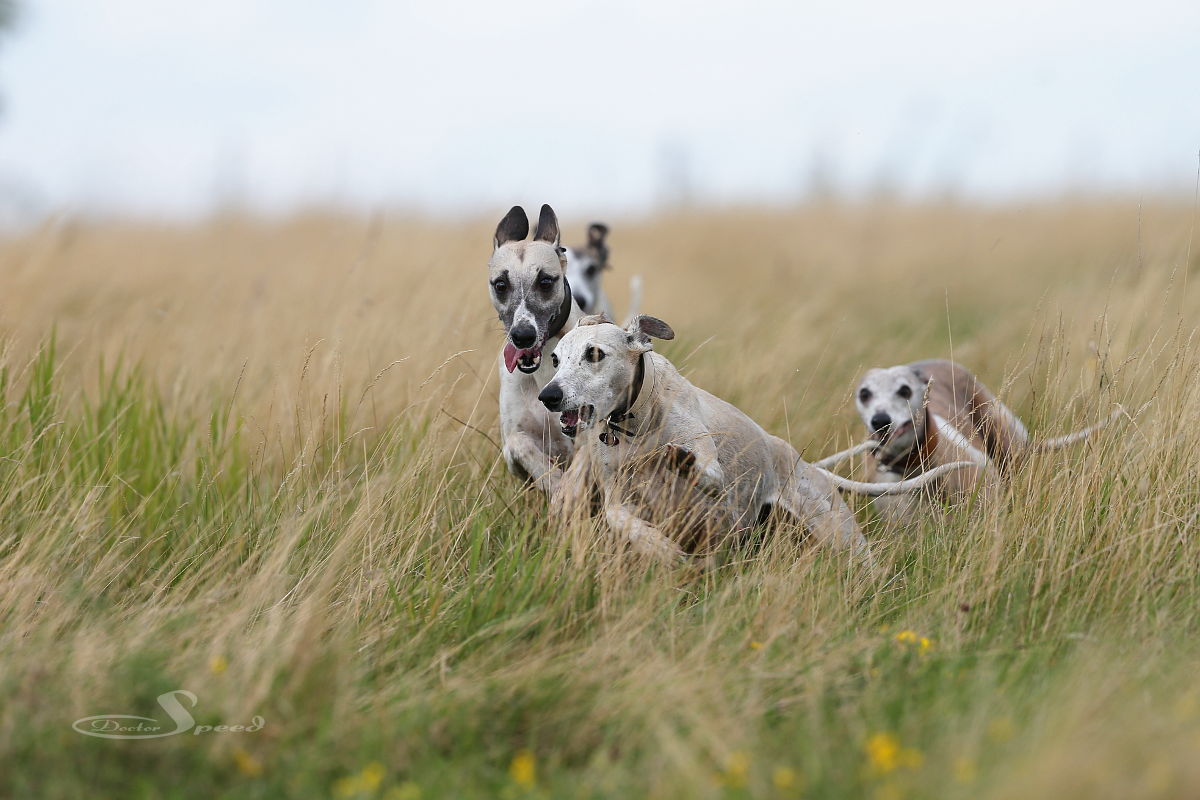 Einzig das nach wie vor sehr hoch stehende Gras stört. Allerdings nur mich beim Fotografieren. Die Hunde lieben es durch die „Savanne“ zu rasen. Hang ‚rauf, Hang ‚runter. Dazu muss man wohl auch nicht viel Worte machen. Sie genügen sich selbst. Sie brauchen weder Ball noch Frisby um in die Gänge zu kommen. Sie laufen aus Spaß und geben alles. Und ich bin nach wie vor fasziniert, wenn eine Gruppe Whippets richtig Gas gibt.