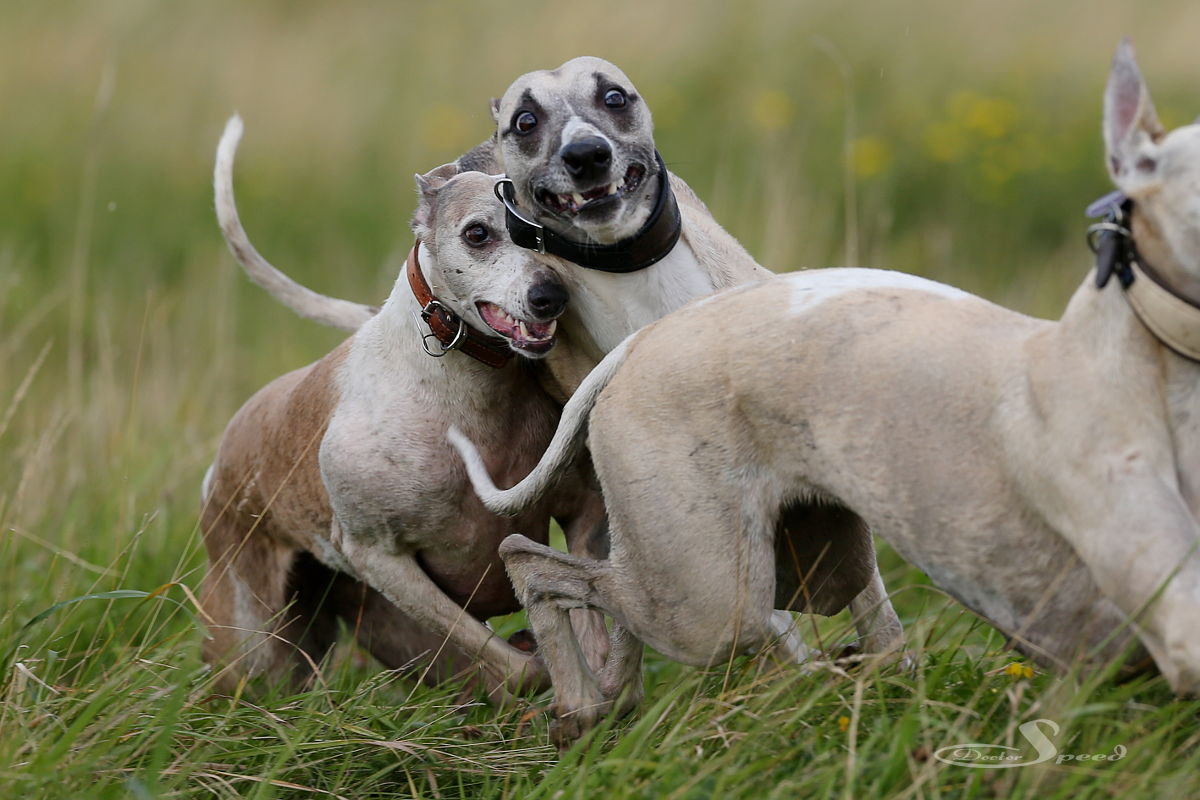 Das sind diese Momente, in denen ich es noch mehr als gewöhnlich zu schätzen weiß, gesellige, freundliche und handliche Hunde zu haben. Mit ihnen kann ich mich nämlich einfach auf eine Wiese stellen und ganz entspannt zuschauen, wie sie sich austoben. In den seltensten Fällen leinen Passanten hecktisch ihren Vierbeiner an, weil sie Angst haben, er könnte erdrückt, gefressen oder einfach eingeatmet werden. Obwohl das auch ein grober Fehler sein kann, denn die Dynamik eines Whippetrudels, so habe ich gelernt, ist nicht zu unterschätzen.