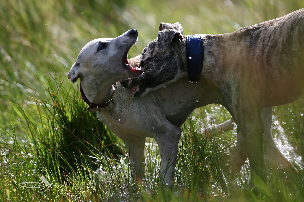 Gestern hockte ich mit der Kamera in der Nähe von Danny und seinen beiden Schwestern Turtle und Pina, die in einem der Tümpel tobten. Ich schaute kurz auf und sah über den oberen Weg einen Mann mit einem Hund kommen. Obwohl Hund eigentlich das falsche Wort ist. Mit einem Koloss. Wir hatten diesen Mann noch nie vorher dort gesehen, fischten also flott die Kleinen aus dem Tümpel und riefen die Großen ‚ran. Zack, zack, zack Leinen dran. Besser ist das, so dachten wir.