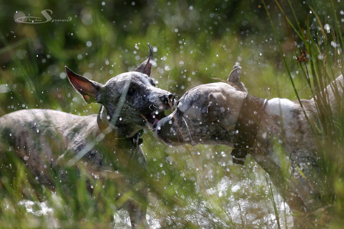 Wenn vier erwachsene Whippets und drei Welpen eine riesige Haldenlandschaft für sich ganz alleine haben, dann ist das paradiesisch. Wenn der große Regen in den Senken auch noch kleine Tümpel hinterlassen hat, dann ist das nicht zu toppen.