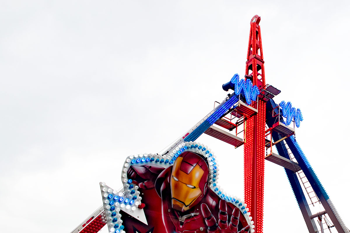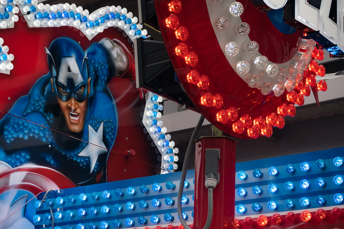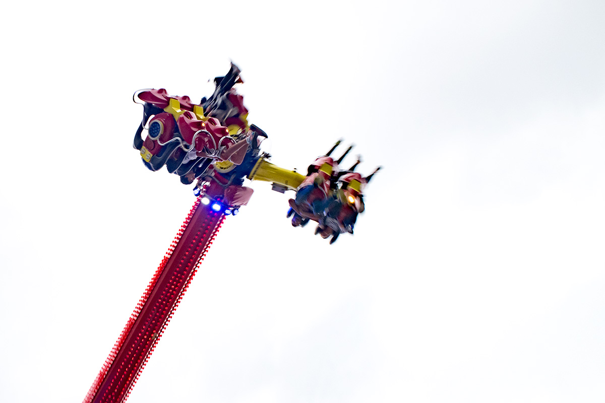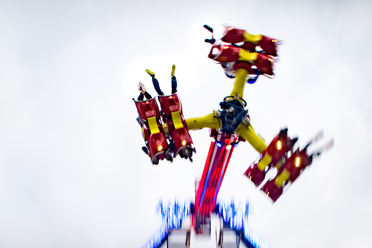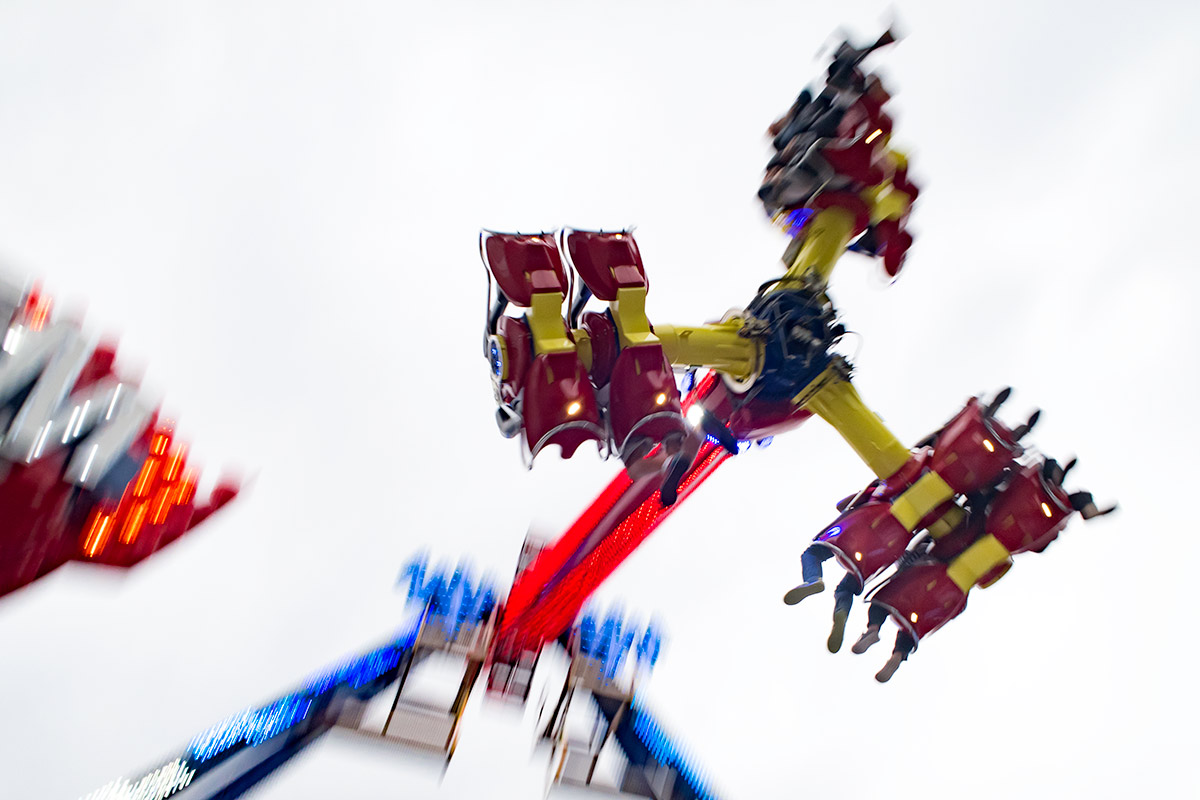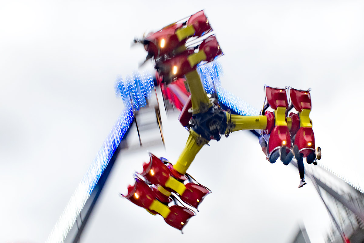 Zur allgemeinen Belustigung gab es in einem der Innenhöfe ein Fahrgeschäft, Karussell, Folterinstrument – wie auch immer man das nennen mag. Ich würde das Ding niemals betreten, aber ich hatte großen Spaß daran, ein paar Bilder zu machen. Außerdem sollte die kleine PowerShot G7 X Mark II mal richtig zeigen, was sie kann. Beim Mitziehen mit diesem Höllengefährt wurde mir zwar fast so schlecht, als hätte ich selber in einer der Gondeln gesessen, doch die Ergebnisse finde ich klasse. Nicht ein einziges Mal habe ich die Große vermisst. Und ihr Gewicht erst recht nicht.