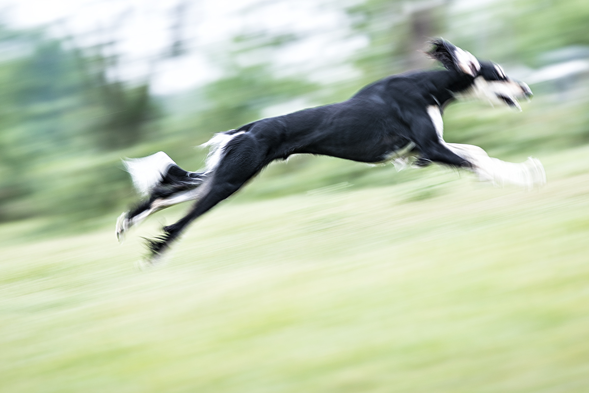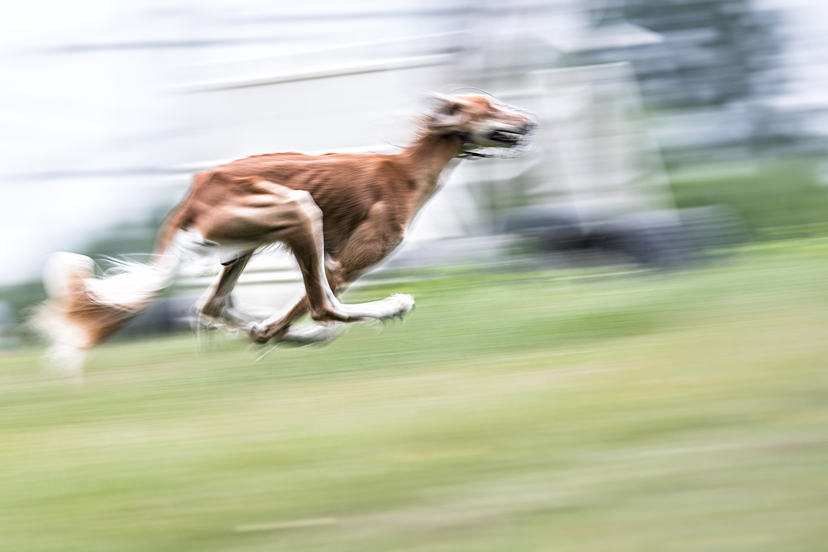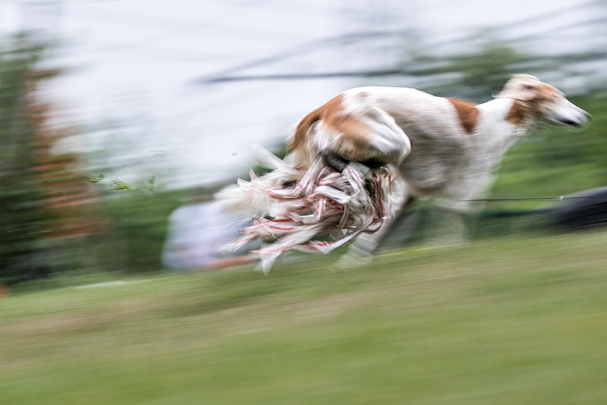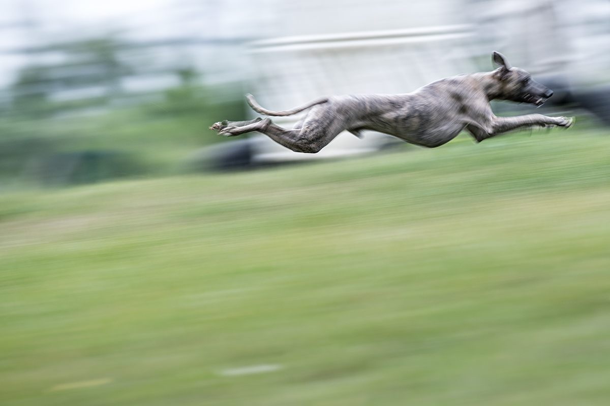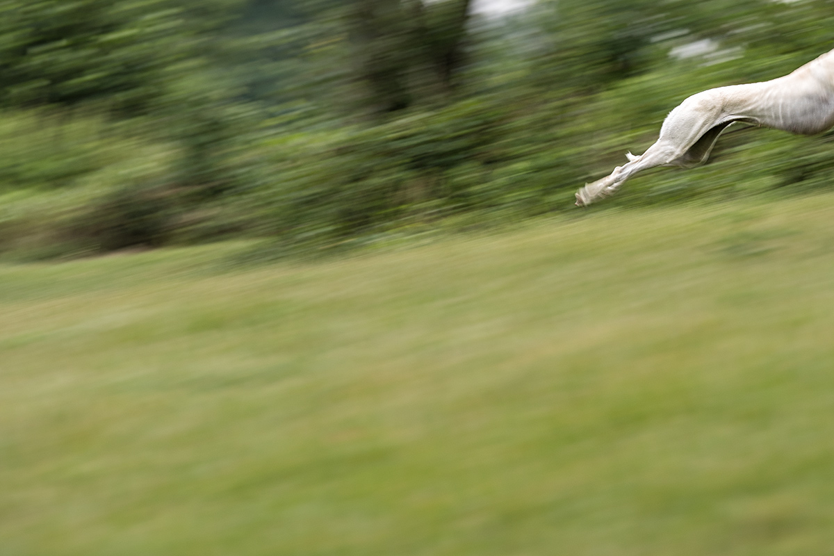 Aber muss das immer sein? Vielleicht mag ich es, wenn sich das Tier in seiner Bewegung komplett auflöst, wenn nur eine Pfote oder ein Muskel scharf ist? Schließlich sind diese Fotos keine Portraits. Ihr Thema ist die Geschwindigkeit selbst. Das Individuum Hund tritt dabei vollkommen in den Hintergrund. Und wenn ich es mal wieder auf die Spitze treibe, kommen manchmal Foto dabei heraus, mit denen ich nicht gerechnet habe, die ich – ich ganz allein – großartig finde und die mich zu mehr anstacheln.