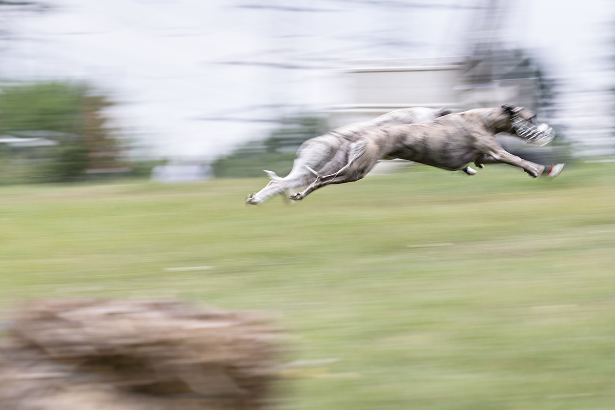 Ich habe an der Rennbahn schon mehrfach mit 200mm verschieden lange Belichtungszeiten (1/60 sek. – 1/40 sek.) ausprobiert und hinterher genau sehen können, was noch geht und was nicht mehr. Hierbei ist natürlich das Tempo der Hunde im Verhältnis zu ihrer Größe von ganz wesentlicher Bedeutung. Je größer die Hunde, desto größer sind ihre Bewegungen. Je größer die Bewegung, desto länger kann ich belichten. Logisch, oder? Doch manche großen Hunde, wie die Greyhounds, sind dabei schneller, als die kleinen Hunde mit ihren kleineren und deshalb in sich schnelleren Bewegungen. Tricky! Denn dann muss ich trotz der größeren Bewegungen doch eine marginal kürzere Belichtungszeit wählen. Also anstelle von 1/60 mit knirschenden Zähnen 1/80 sek.