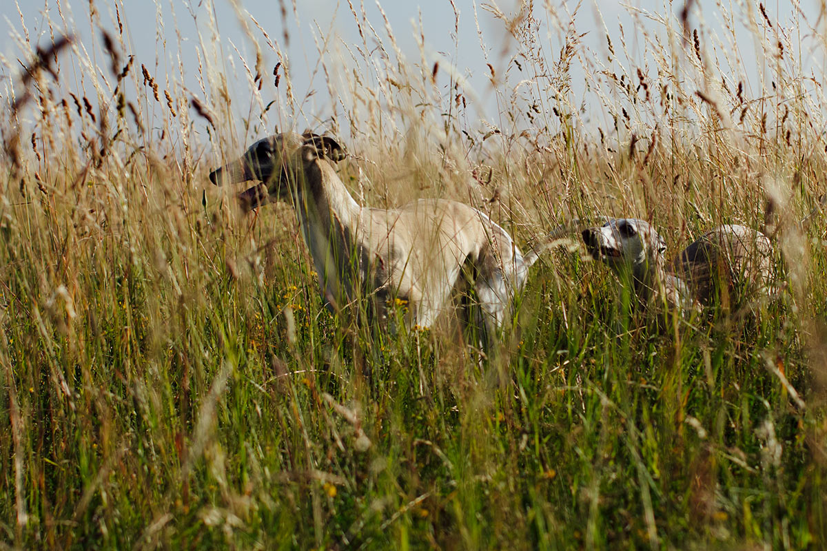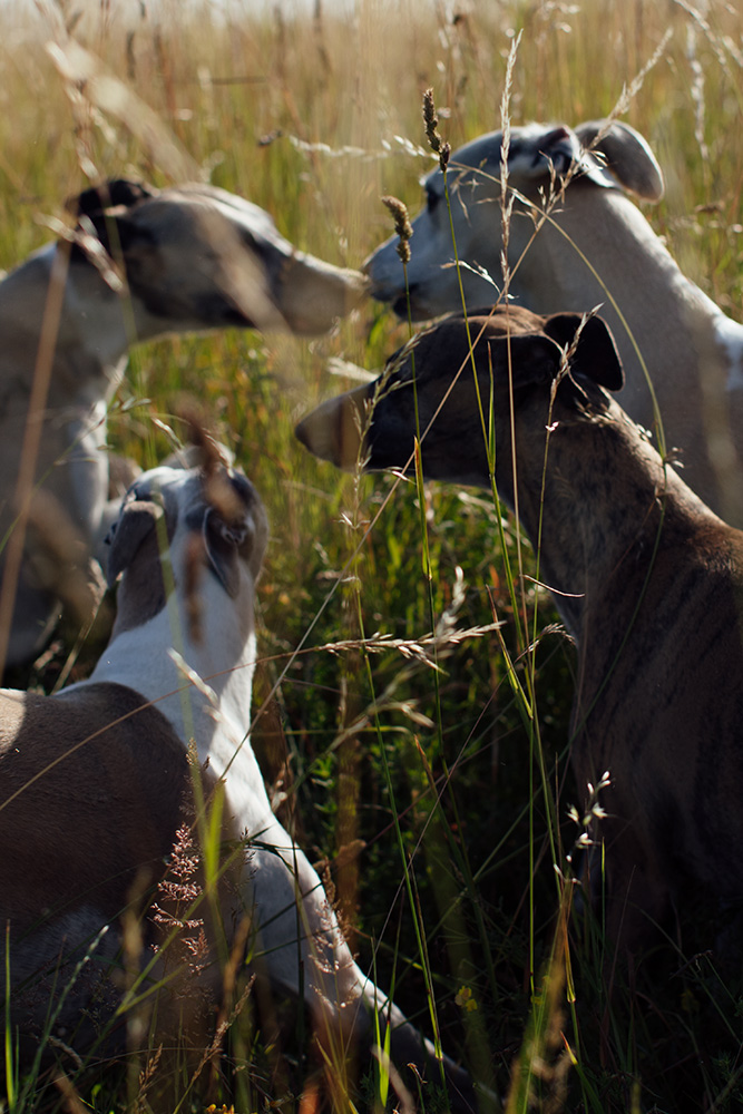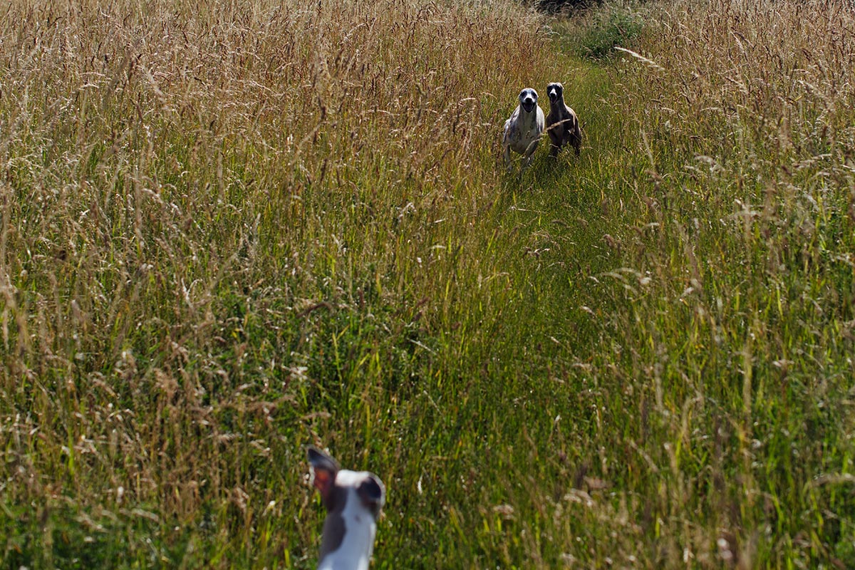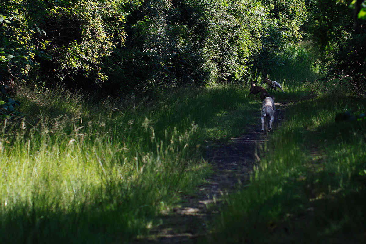 Am frühen Morgen ist es noch kühl genug. 17 Grad um 7:30 Uhr gehen gerade noch. Mono, Danny und Lianes Weiberrudel lieben die schattigen Wege, die sich die Halde hinauf winden. Dort können sie sich richtig auspowern. Oben auf den großen Wiesen gibt es keinen Schatten. Dort wird es sehr schnell sehr warm. Um 9:30 ist Schluss. Ab nach Hause, Futtern und Schlafen.