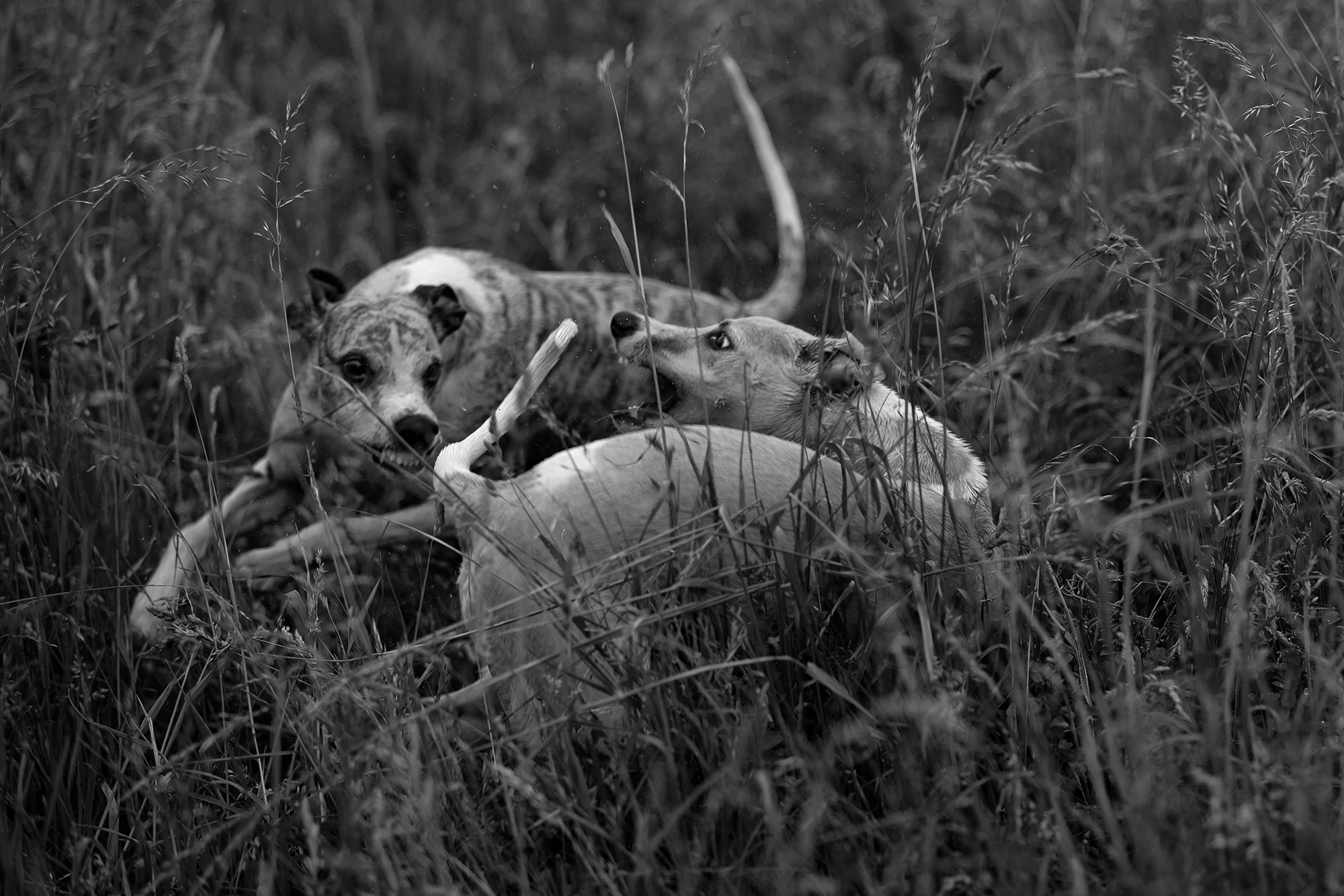 Zum Glück waren beide Jecken schnell im dichten Gras stecken geblieben und bahnten sich nun langsam ihren Weg zurück zu mir. So und jetzt mal das ganze Etepetete mit „Oooh, wie fein, dass du da bist!“ zur Seite. Meine Hunde wissen, dass sie „fein“ sind, wenn sie auf Ruf zu mir kommen. Aber wenn sie Mist bauen, muss ich ihnen das ebenfalls sehr deutlich kommunizieren. Es gab also den Anpfiff des Jahrhunderts, natürlich auch verbeugend. Ein fünfeinhalb Monate alter Junghund hat nicht vom seinem großen Kumpel zu lernen, dass Rehe spannend sind. Weiter ging es dann mit angeklebten Ohren und ein paar Rückrufen mehr als üblich.